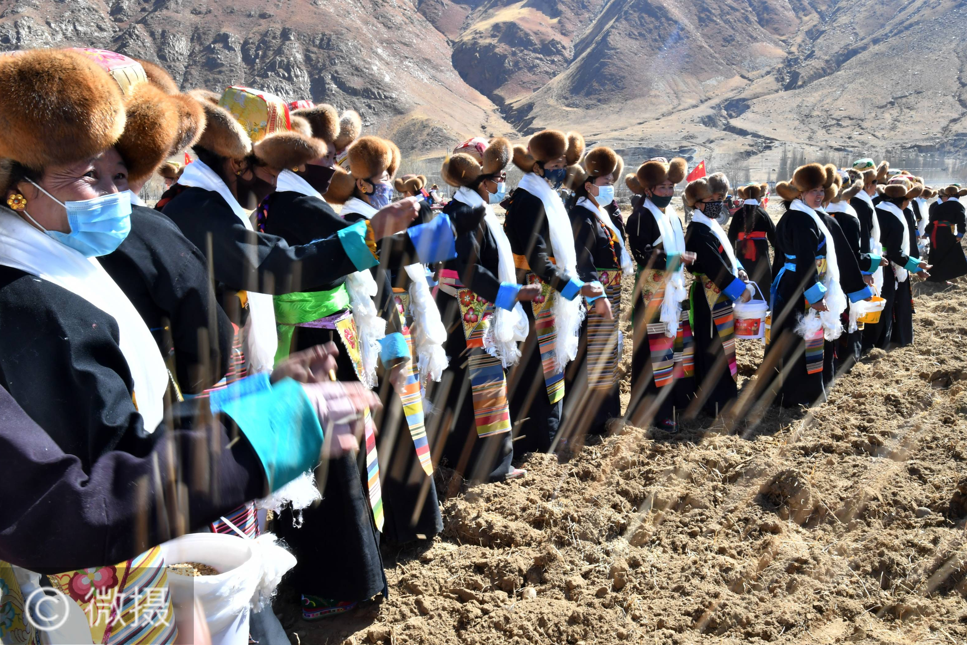 3月16日,西藏拉萨市达孜区塔杰乡妇女在播撒种子。当日,位于雅鲁藏布江中游的西藏拉萨市、日喀则市、山南市等地农村启动春耕春播,播撒春天的第一粒种子。各地农村按着传统方式,穿着盛装,端着青稞酒,在田间地头举行开春仪式。新华社记者 觉果 摄