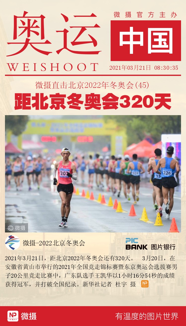 2021年3月21日,距北京2022年冬奥会还有320天。 3月20日,在安徽省黄山市举行的2021年全国竞走锦标赛暨东京奥运会选拔赛男子20公里竞走比赛中,广东队选手王凯华以1小时16分54秒的成绩获得冠军,并打破全国纪录。新华社记者 杜宇 摄