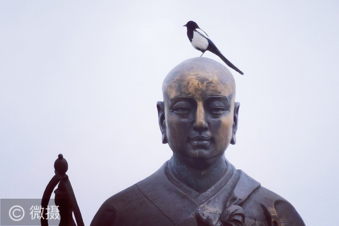 今天上午11时许,一只喜鹊落上了西安大雁塔南广场玄奘雕塑的头顶。喜鹊又称吉祥鸟,其声音是“喳喳喳喳,有点像“喜事到家”。佛教一代尊师玄奘头顶落喜鹊,应是佛家和众生都有喜事和好事吧。