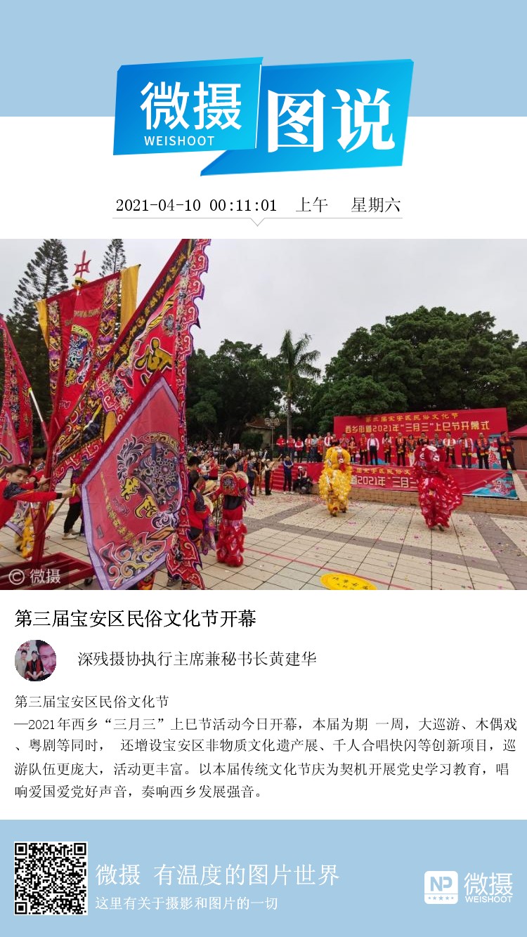 第三届宝安区民俗文化节 —2021年西乡“三月三”上巳节活动今日开幕,本届为期 一周,大巡游、木偶戏、粤剧等同时, 还增设宝安区非物质文化遗产展、千人合唱快闪等创新项目,巡游队伍更庞大,活动更丰富。以本届传统文化节庆为契机开展党史学习教育,唱响爱国爱党好声音,奏响西乡发展强音。