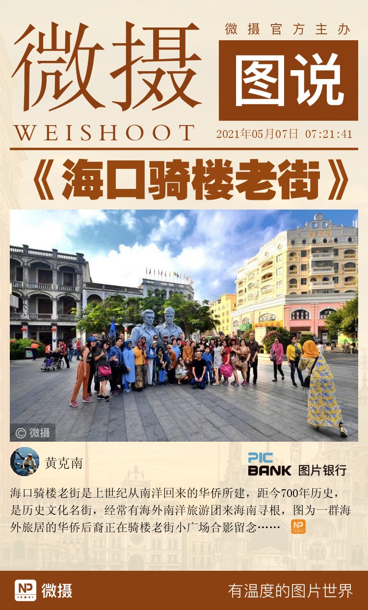 海口骑楼老街是上世纪从南洋回来的华侨所建,距今700年历史,是历史文化名街,经常有海外南洋旅游团来海南寻根,图为一群海外旅居的华侨后裔正在骑楼老街小广场合影留念……