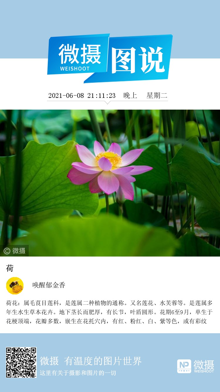 荷花:属毛茛目莲科,是莲属二种植物的通称。又名莲花、水芙蓉等。是莲属多年生水生草本花卉。地下茎长而肥厚,有长节,叶盾圆形。花期6至9月,单生于花梗顶端,花瓣多数,嵌生在花托穴内,有红、粉红、白、紫等色,或有彩纹