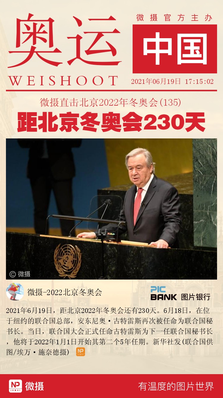 2021年6月19日,距北京2022年冬奥会还有230天。6月18日,在位于纽约的联合国总部,安东尼奥·古特雷斯再次被任命为联合国秘书长。当日,联合国大会正式任命古特雷斯为下一任联合国秘书长,他将于2022年1月1日开始其第二个5年任期。新华社发(联合国供图/埃万·施奈德摄)