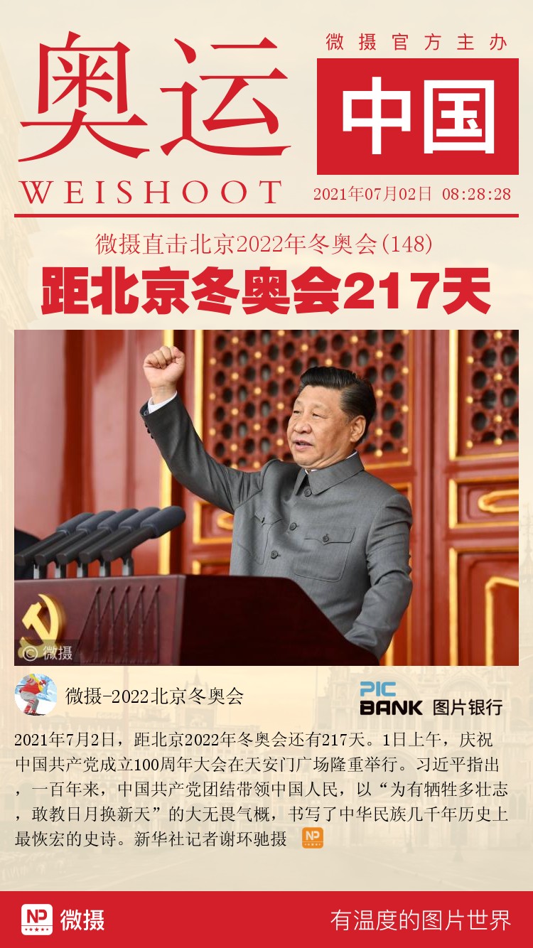2021年7月2日,距北京2022年冬奥会还有217天。1日上午,庆祝中国共产党成立100周年大会在天安门广场隆重举行。习近平指出,一百年来,中国共产党团结带领中国人民,以“为有牺牲多壮志,敢教日月换新天”的大无畏气概,书写了中华民族几千年历史上最恢宏的史诗。新华社记者谢环驰摄