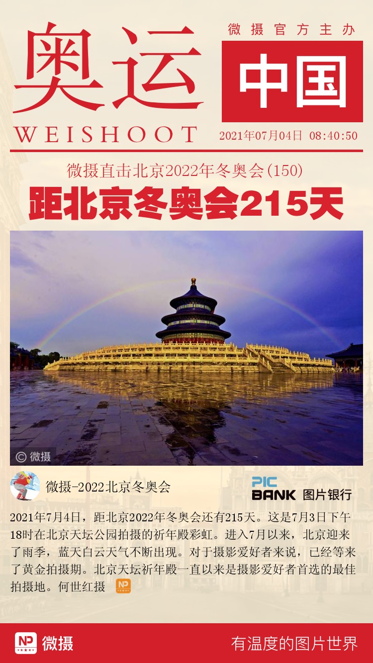 2021年7月4日,距北京2022年冬奥会还有215天。这是7月3日下午18时在北京天坛公园拍摄的祈年殿彩虹。进入7月以来,北京迎来了雨季,蓝天白云天气不断出现。对于摄影爱好者来说,已经等来了黄金拍摄期。北京天坛祈年殿一直以来是摄影爱好者首选的最佳拍摄地。何世红摄