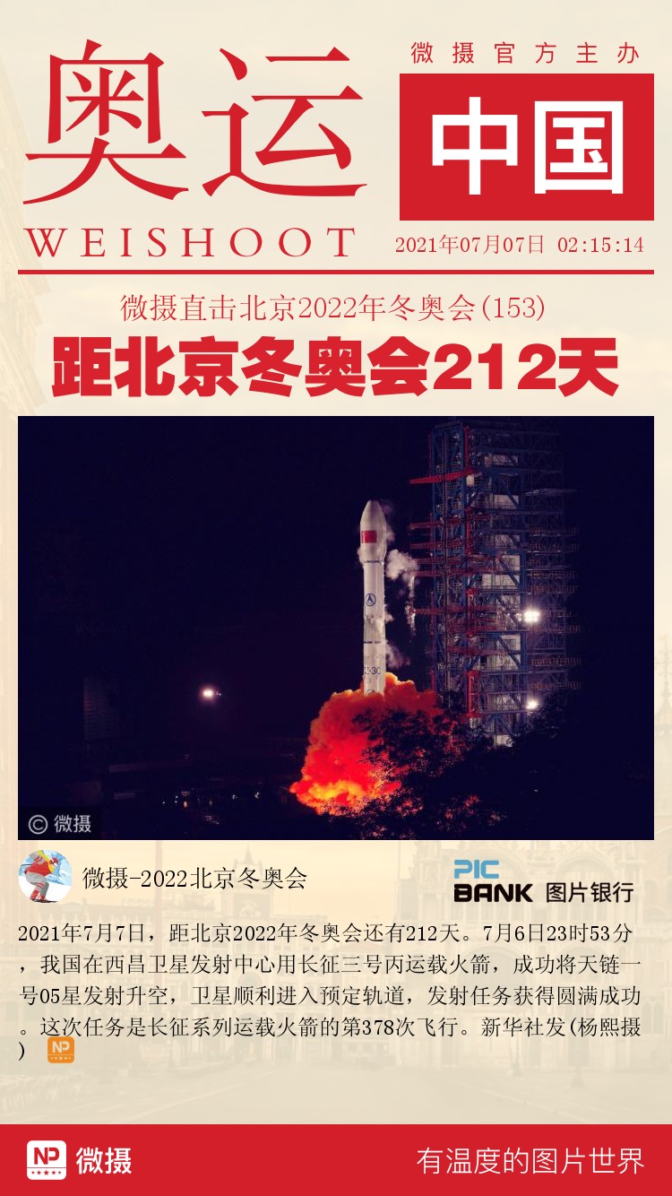 2021年7月7日,距北京2022年冬奥会还有212天。7月6日23时53分,我国在西昌卫星发射中心用长征三号丙运载火箭,成功将天链一号05星发射升空,卫星顺利进入预定轨道,发射任务获得圆满成功。这次任务是长征系列运载火箭的第378次飞行。新华社发(杨熙摄)