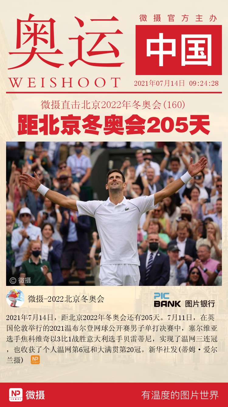 2021年7月14日,距北京2022年冬奥会还有205天。7月11日,在英国伦敦举行的2021温布尔登网球公开赛男子单打决赛中,塞尔维亚选手焦科维奇以3比1战胜意大利选手贝雷蒂尼,实现了温网三连冠,也收获了个人温网第6冠和大满贯第20冠。新华社发(蒂姆·爱尔兰摄)