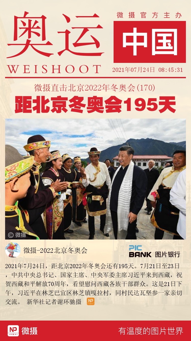 2021年7月24日,距北京2022年冬奥会还有195天。7月21日至23日,中共中央总书记、国家主席、中央军委主席习近平来到西藏,祝贺西藏和平解放70周年,看望慰问西藏各族干部群众。这是21日下午,习近平在林芝巴宜区林芝镇嘎拉村,同村民达瓦坚参一家亲切交流。 新华社记者谢环驰摄
