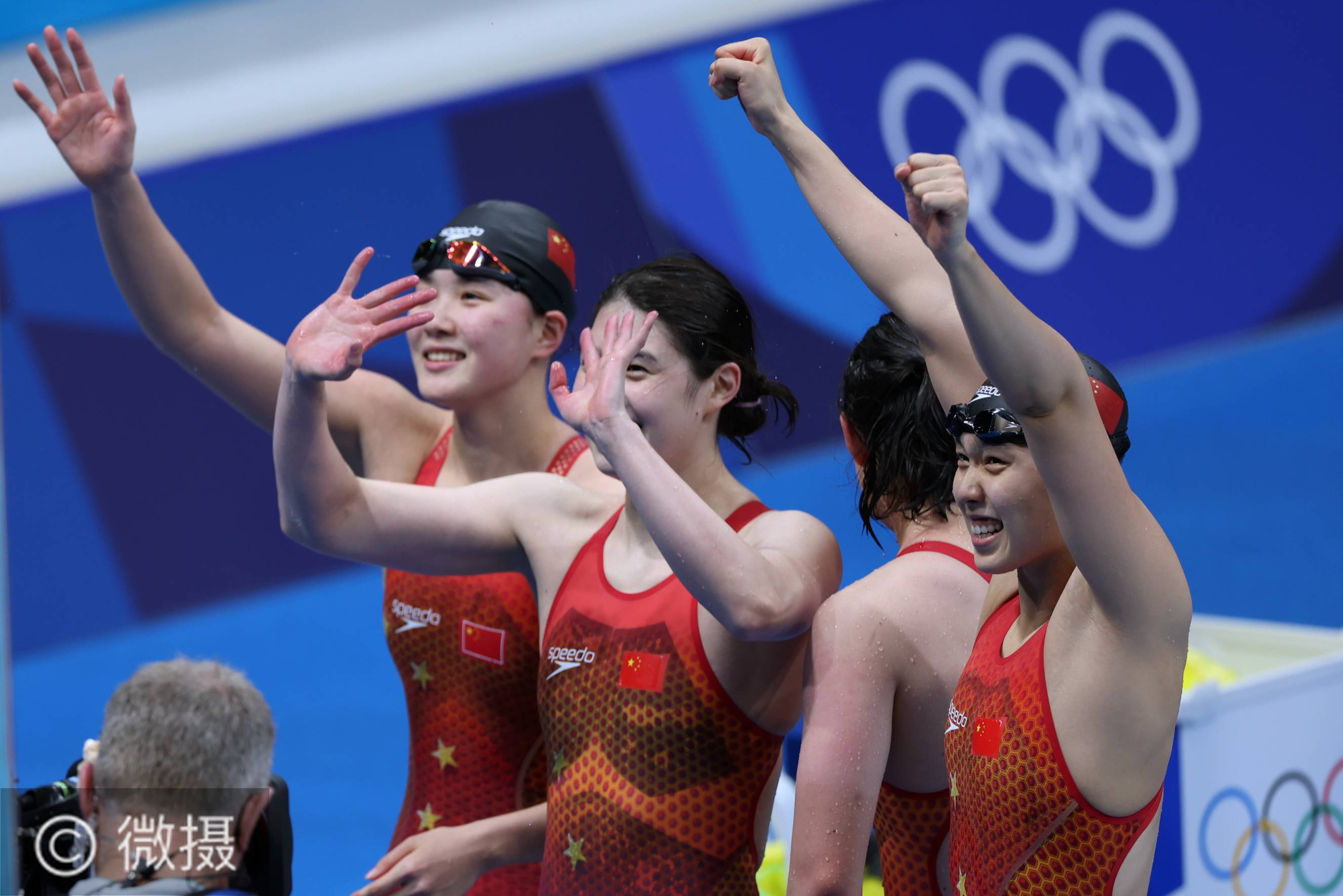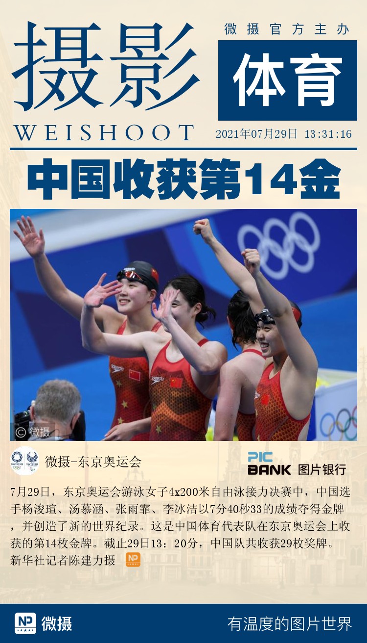 7月29日,东京奥运会游泳女子4x200米自由泳接力决赛中,中国选手杨浚瑄、汤慕涵、张雨霏、李冰洁以7分40秒33的成绩夺得金牌,并创造了新的世界纪录。这是中国体育代表队在东京奥运会上收获的第14枚金牌。截止29日13:20分,中国队共收获29枚奖牌。新华社记者陈建力摄