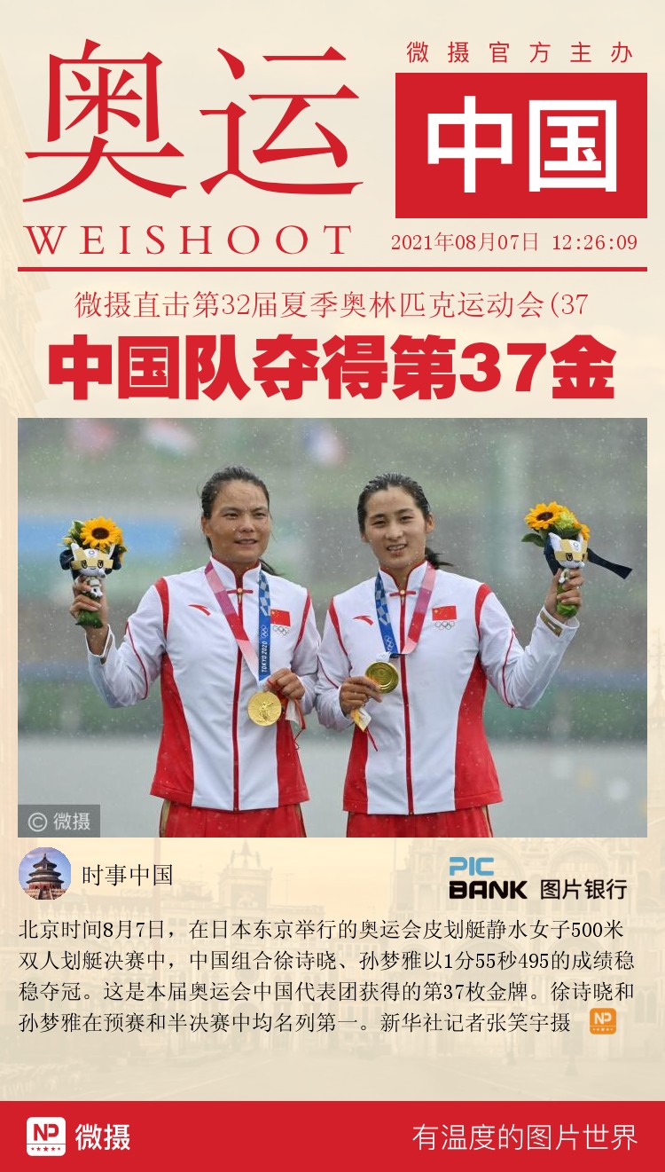 北京时间8月7日,在日本东京举行的奥运会皮划艇静水女子500米双人划艇决赛中,中国组合徐诗晓、孙梦雅以1分55秒495的成绩稳稳夺冠。这是本届奥运会中国代表团获得的第37枚金牌。徐诗晓和孙梦雅在预赛和半决赛中均名列第一。新华社记者张笑宇摄