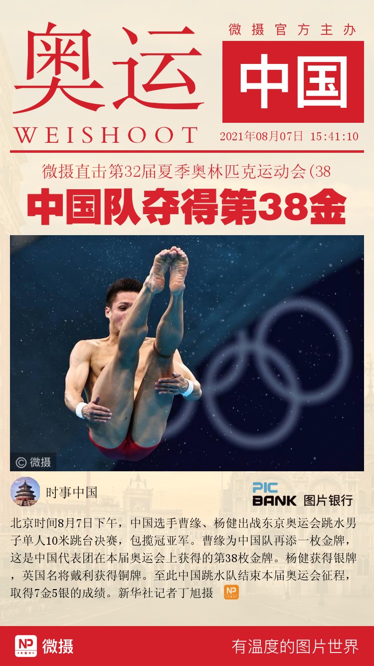 北京时间8月7日下午,中国选手曹缘、杨健出战东京奥运会跳水男子单人10米跳台决赛,包揽冠亚军。曹缘为中国队再添一枚金牌,这是中国代表团在本届奥运会上获得的第38枚金牌。杨健获得银牌,英国名将戴利获得铜牌。至此中国跳水队结束本届奥运会征程,取得7金5银的成绩。新华社记者丁旭摄