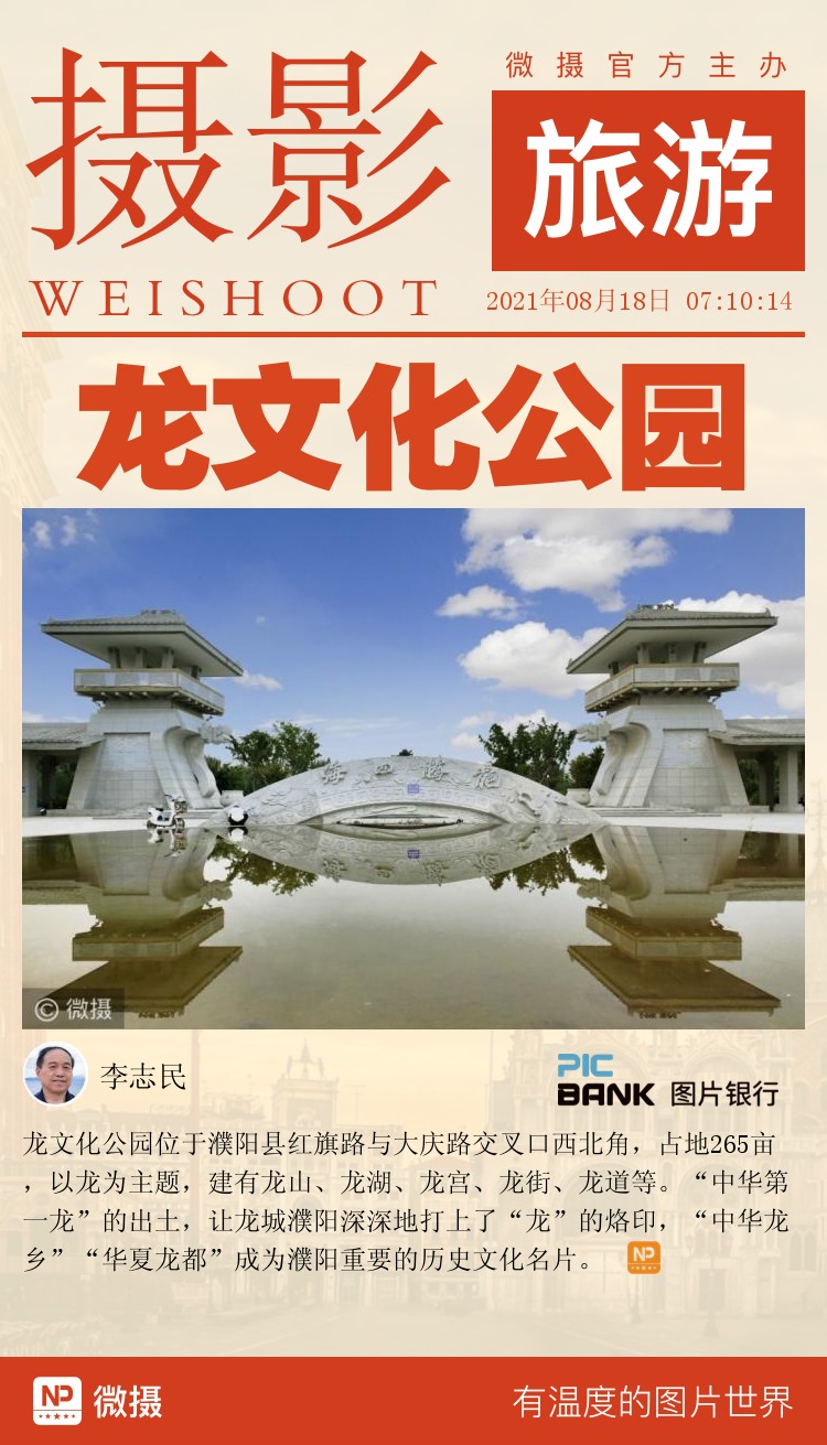 龙文化公园位于濮阳县红旗路与大庆路交叉口西北角,占地265亩,以龙为主题,建有龙山、龙湖、龙宫、龙街、龙道等。“中华第一龙”的出土,让龙城濮阳深深地打上了“龙”的烙印,“中华龙乡”“华夏龙都”成为濮阳重要的历史文化名片。