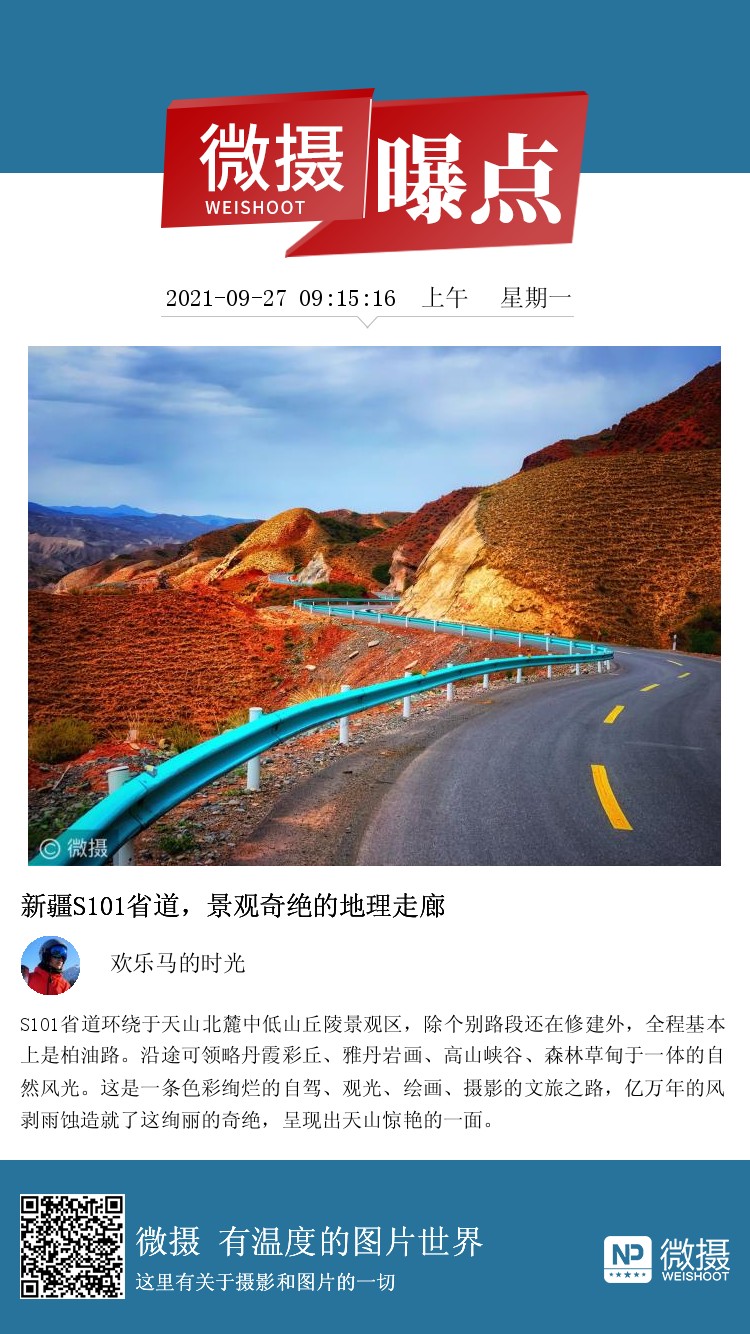S101省道环绕于天山北麓中低山丘陵景观区,除个别路段还在修建外,全程基本上是柏油路。沿途可领略丹霞彩丘、雅丹岩画、高山峡谷、森林草甸于一体的自然风光。这是一条色彩绚烂的自驾、观光、绘画、摄影的文旅之路,亿万年的风剥雨蚀造就了这绚丽的奇绝,呈现出天山惊艳的一面。