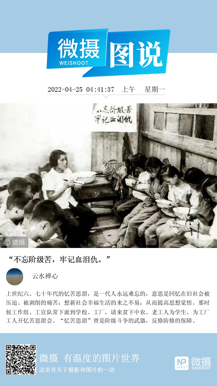 上世纪六、七十年代的忆苦思甜,是一代人永远难忘的,意思是回忆在旧社会被压迫、被剥削的痛苦;想新社会幸福生活的来之不易;从而提高思想觉悟。那时候工作组、工宣队常下派到学校、工厂,请来贫下中农、老工人为学生、为工厂工人开忆苦思甜会。“忆苦思甜”曾是阶级斗争的武器,反修防修的保障。