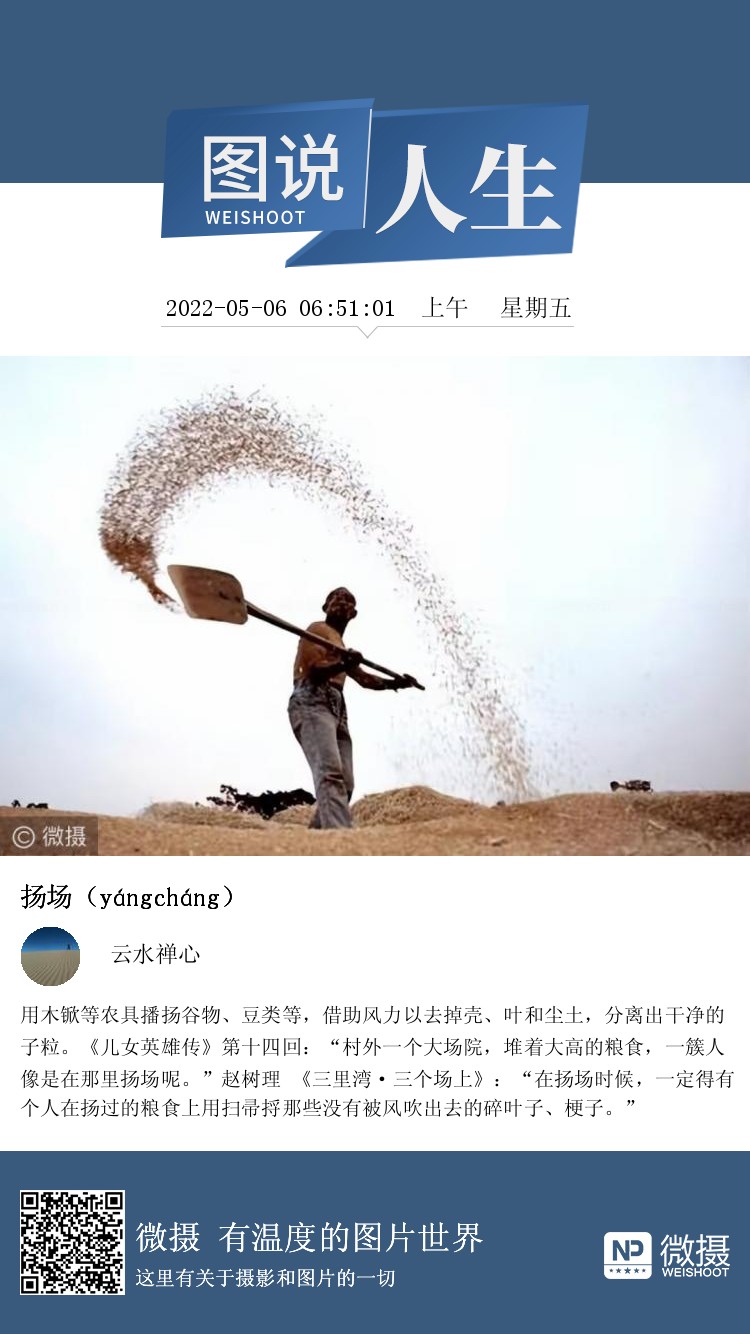 用木锨等农具播扬谷物、豆类等,借助风力以去掉壳、叶和尘土,分离出干净的子粒。《儿女英雄传》第十四回:“村外一个大场院,堆着大高的粮食,一簇人像是在那里扬场呢。”赵树理 《三里湾·三个场上》:“在扬场时候,一定得有个人在扬过的粮食上用扫帚捋那些没有被风吹出去的碎叶子、梗子。”