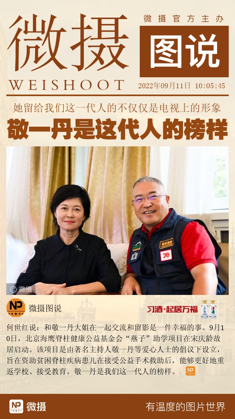何世红说:和敬一丹大姐在一起交流和留影是一件幸福的事。9月10日,北京海鹰脊柱健康公益基金会“燕子”助学项目在宋庆龄故居启动。该项目是由著名主持人敬一丹等爱心人士的倡议下设立,旨在资助贫困脊柱疾病患儿在接受公益手术救助后,能够更好地重返学校、接受教育。敬一丹是我们这一代人的榜样。