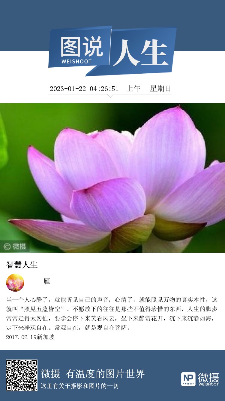 当一个人心静了,就能听见自己的声音;心清了,就能照见万物的真实本性,这就叫“照见五蕴皆空”。不愿放下的往往是那些不值得珍惜的东西,人生的脚步常常走得太匆忙,要学会停下来笑看风云,坐下来静赏花开,沉下来沉静如海,定下来净观自在。常观自在,就是观自在菩萨。 2017.02.19新加坡