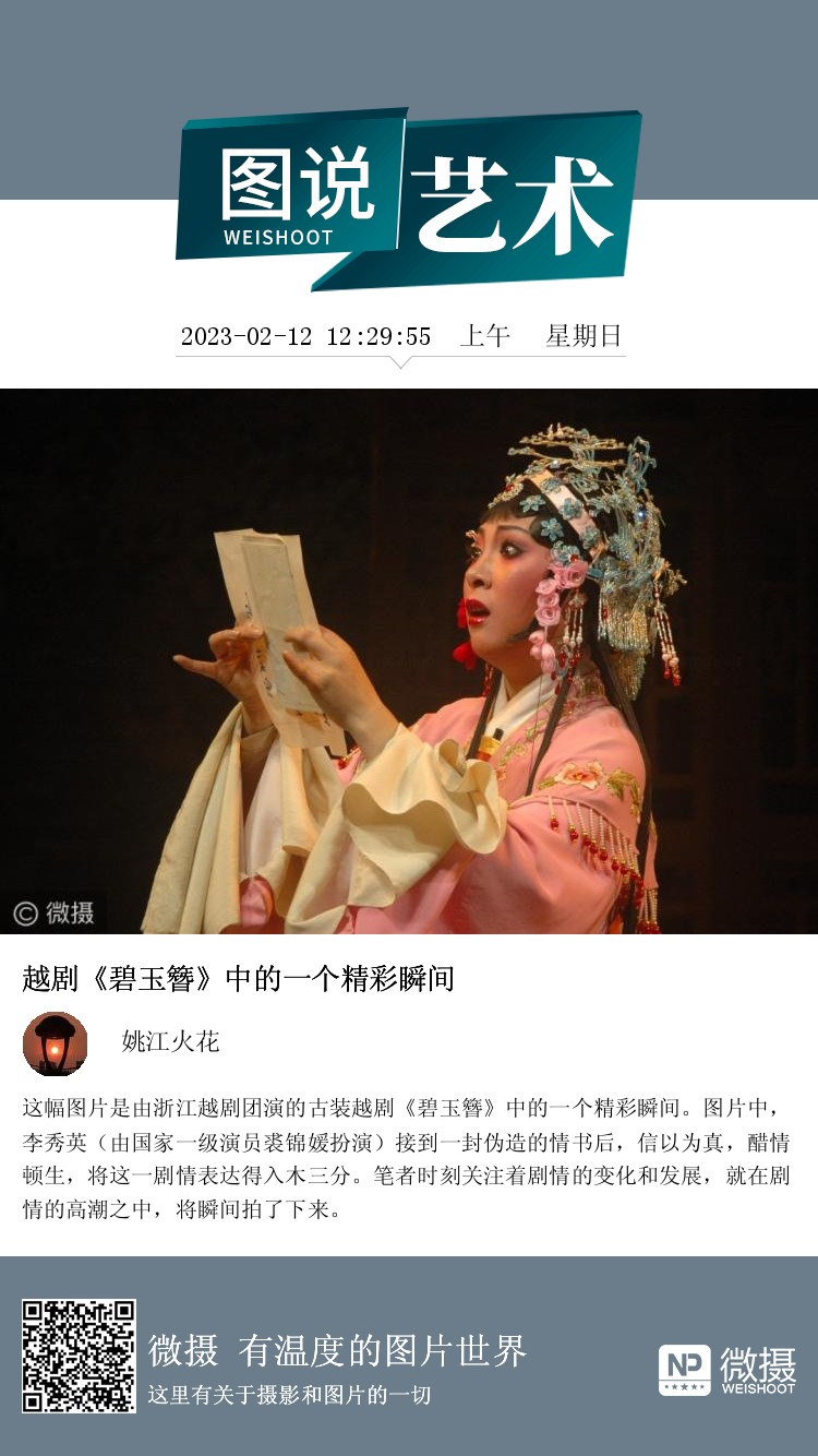 这幅图片是由浙江越剧团演的古装越剧《碧玉簪》中的一个精彩瞬间。图片中,李秀英(由国家一级演员裘锦媛扮演)接到一封伪造的情书后,信以为真,醋情顿生,将这一剧情表达得入木三分。笔者时刻关注着剧情的变化和发展,就在剧情的高潮之中,将瞬间拍了下来。