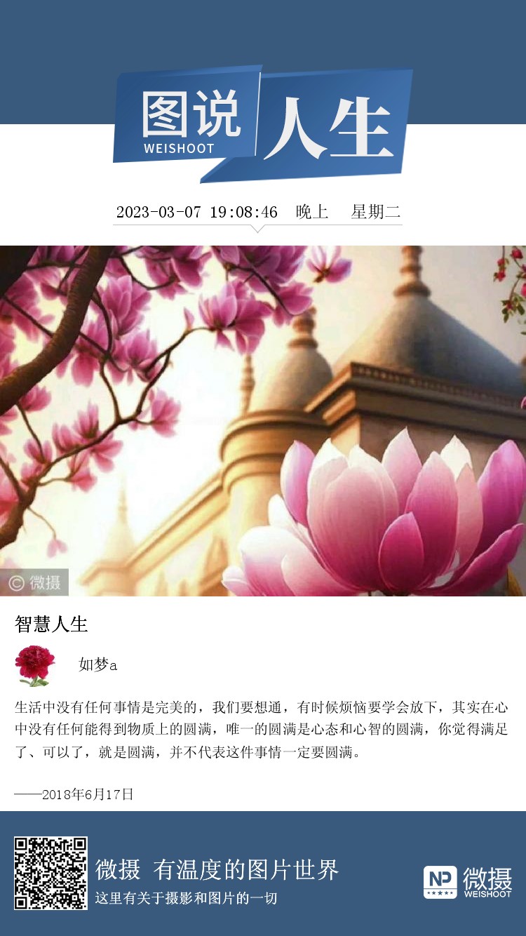 生活中没有任何事情是完美的,我们要想通,有时候烦恼要学会放下,其实在心中没有任何能得到物质上的圆满,唯一的圆满是心态和心智的圆满,你觉得满足了、可以了,就是圆满,并不代表这件事情一定要圆满。 ——2018年6月17日