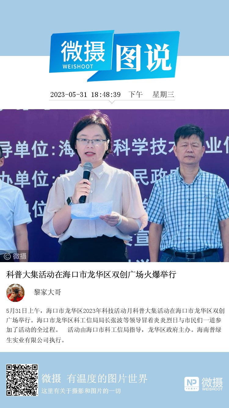 5月31日上午,海口市龙华区2023年科技活动月科普大集活动在海口市龙华区双创广场举行。海口市龙华区科工信局局长张波等领导冒着炎炎烈日与市民们一道参加了活动的全过程。 活动由海口市科工信局指导,龙华区政府主办。海南普绿生实业有限公司执行。