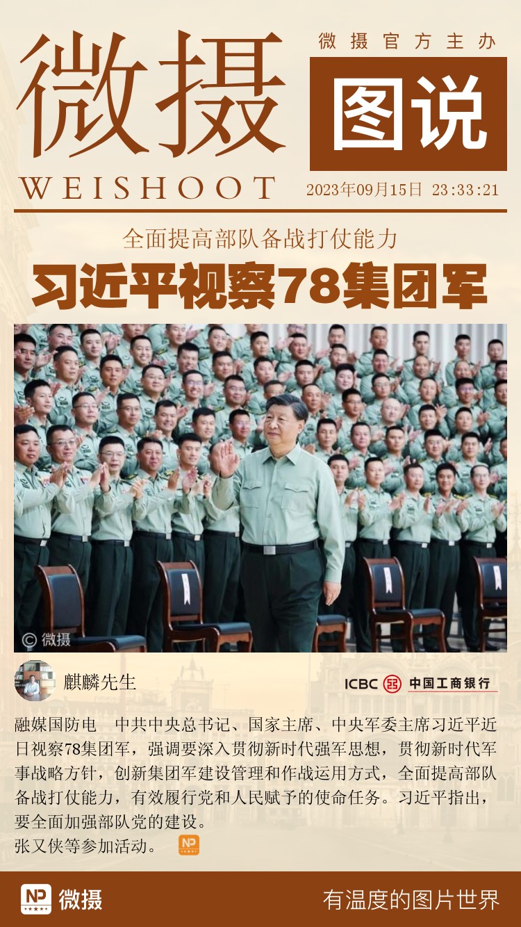 融媒国防电 中共中央总书记、国家主席、中央军委主席习近平近日视察78集团军,强调要深入贯彻新时代强军思想,贯彻新时代军事战略方针,创新集团军建设管理和作战运用方式,全面提高部队备战打仗能力,有效履行党和人民赋予的使命任务。习近平指出,要全面加强部队党的建设。 张又侠等参加活动。