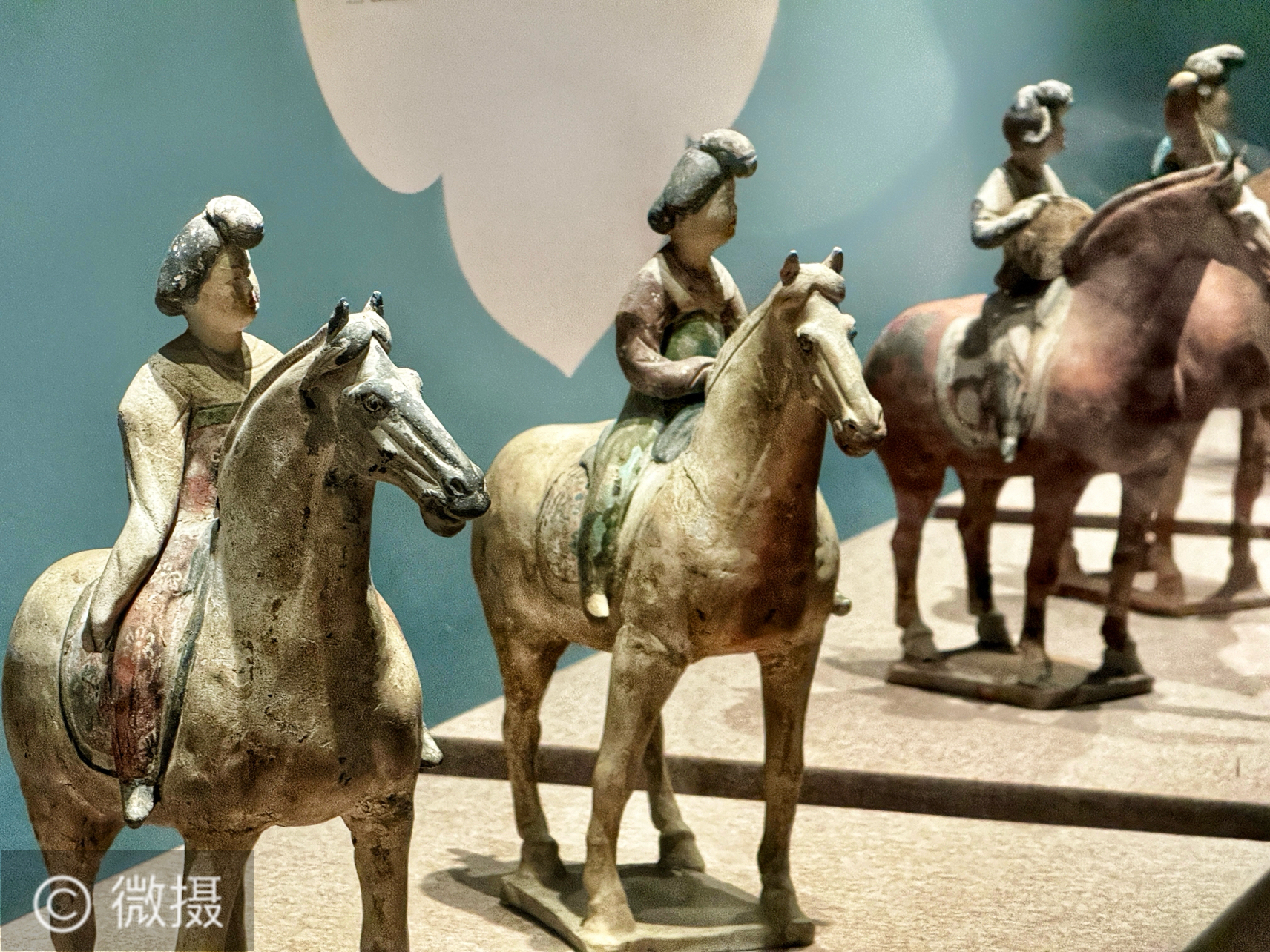 陕西西安大唐金乡县主出土陶俑,露髻驰骋的骑马女俑、戴胡帽穿胡服的骑马女乐俑生动地再现了盛唐时期女子骑马出行的风尚和胡服、胡乐盛行的情景,也从侧面展现了唐代的繁荣昌盛与文化艺术高度发展的成就,和当时民族融合及丝绸之路带来的中西方文化交流互鉴的情况。