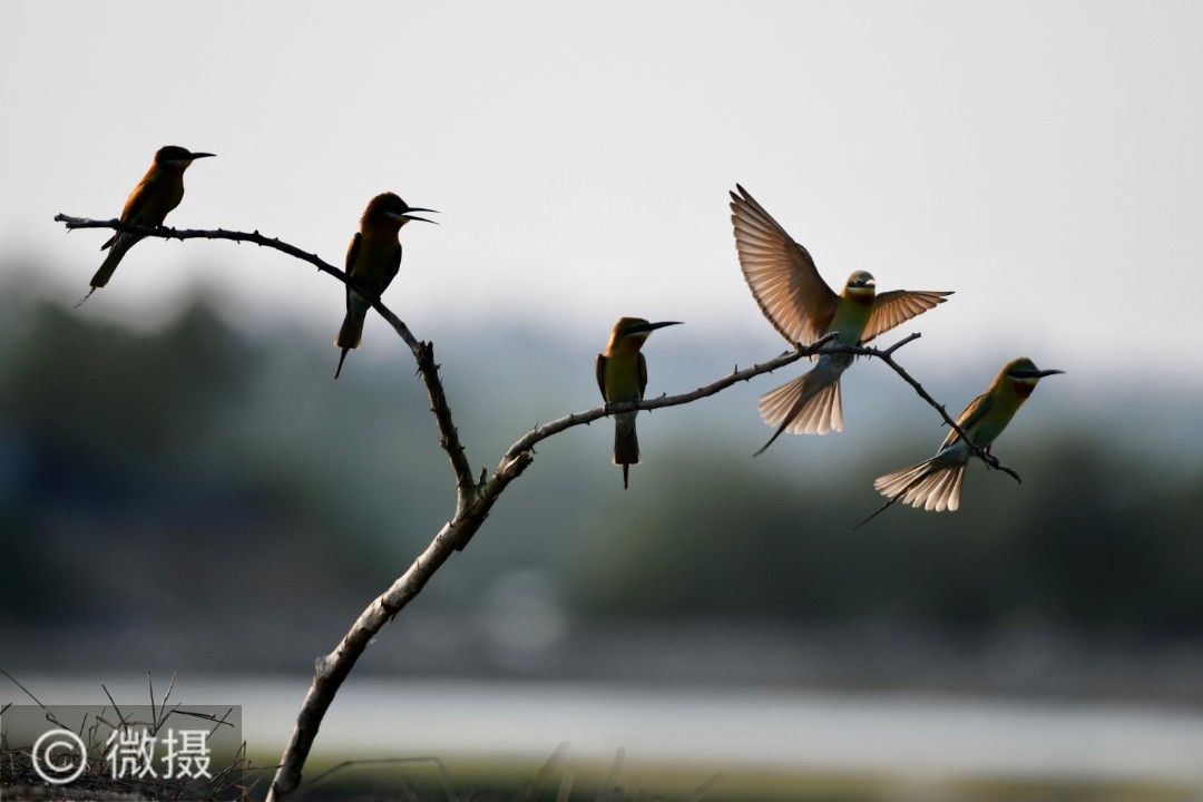 4月3日,海南澄迈的气温已经飙升到37°C。 在澄迈县城花场湾红树林自然保护区内,国家二级保护动物栗喉蜂虎鸟如约而至,开始了长达4个月的繁殖期。从早晨7点开始,鸟儿们就开始在湿地的沙坝侧翼上打洞筑巢、安家落户。