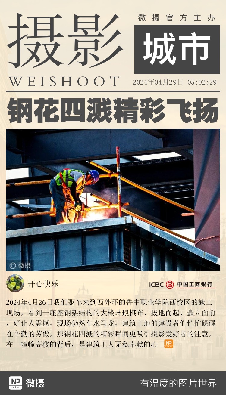 2024年4月26日我们驱车来到西外环的鲁中职业学院西校区的施工现场,看到一座座钢架结构的大楼琳琅棋布、拔地而起、矗立面前,好让人震撼,现场仍然车水马龙,建筑工地的建设者们忙忙碌碌在辛勤的劳做,那钢花四溅的精彩瞬间更吸引摄影爱好者的注意,在一幢幢高楼的背后,是建筑工人无私奉献的心