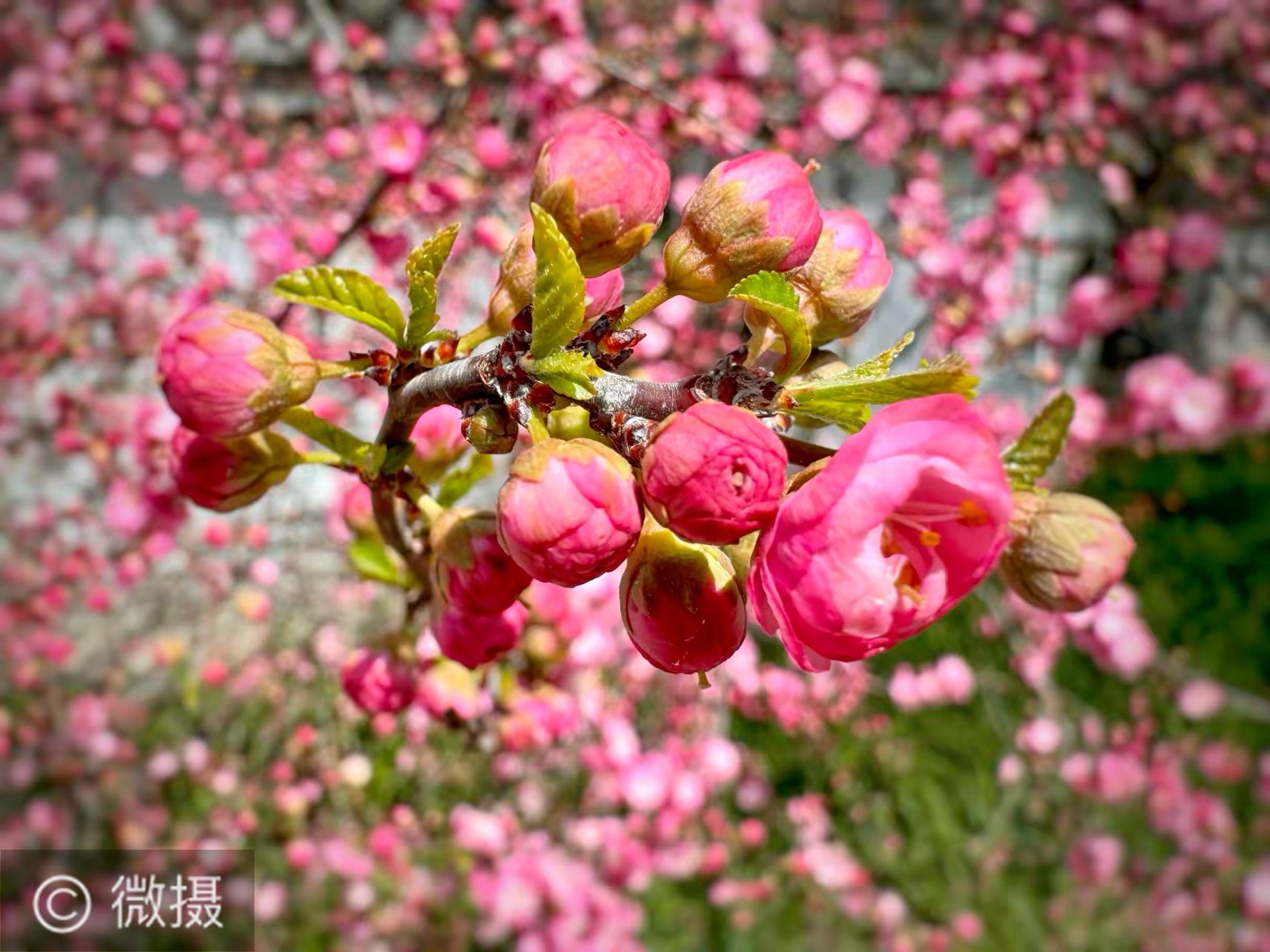 “美艳村居足众愿,随人指点小桃红。”榆叶梅又叫榆梅、小桃红,因其叶片像榆树叶,花朵酷似梅花而得名。作为北方园林及人行道绿化带中常见的观花树种,榆叶梅是一种极具观赏性的花卉,而且品种很多。