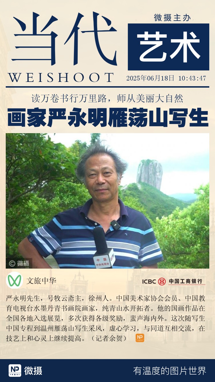 严永明先生,号牧云斋主,徐州人。中国美术家协会会员、中国教育电视台水墨丹青书画院画家,纯青山水开拓者。他的国画作品在全国各地入选展览,多次获得各级奖励,蜚声海内外。这次随写生中国专程到温州雁荡山写生采风,虚心学习,与同道互相交流,在技艺上和心灵上继续提高。(记者余贺)