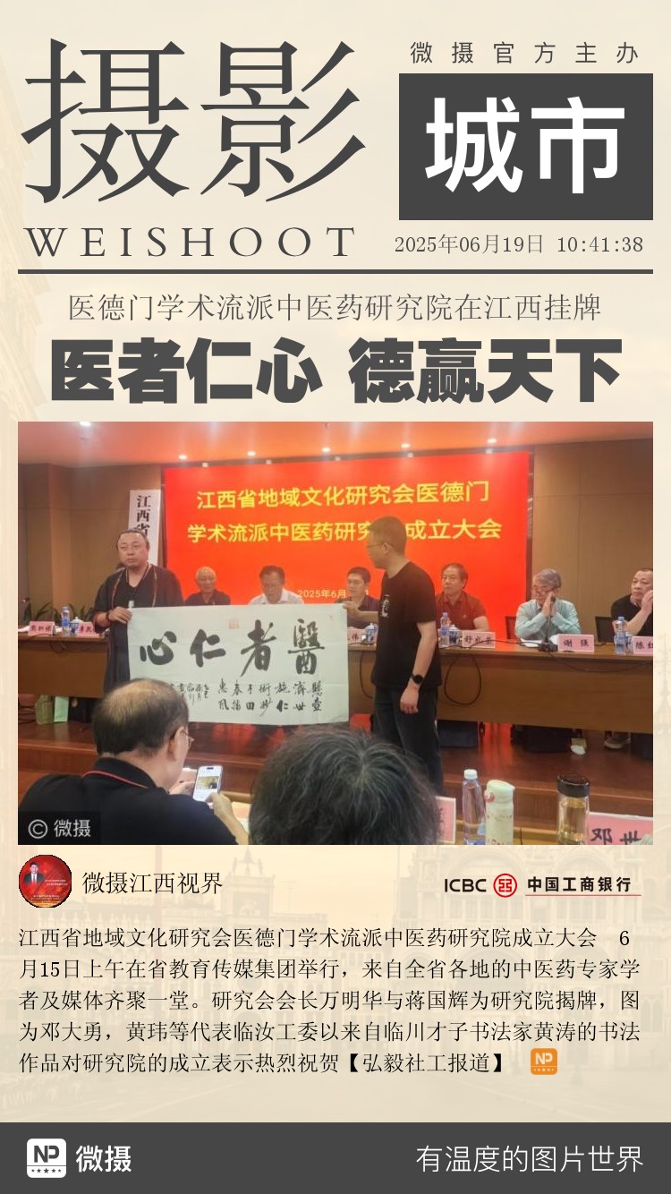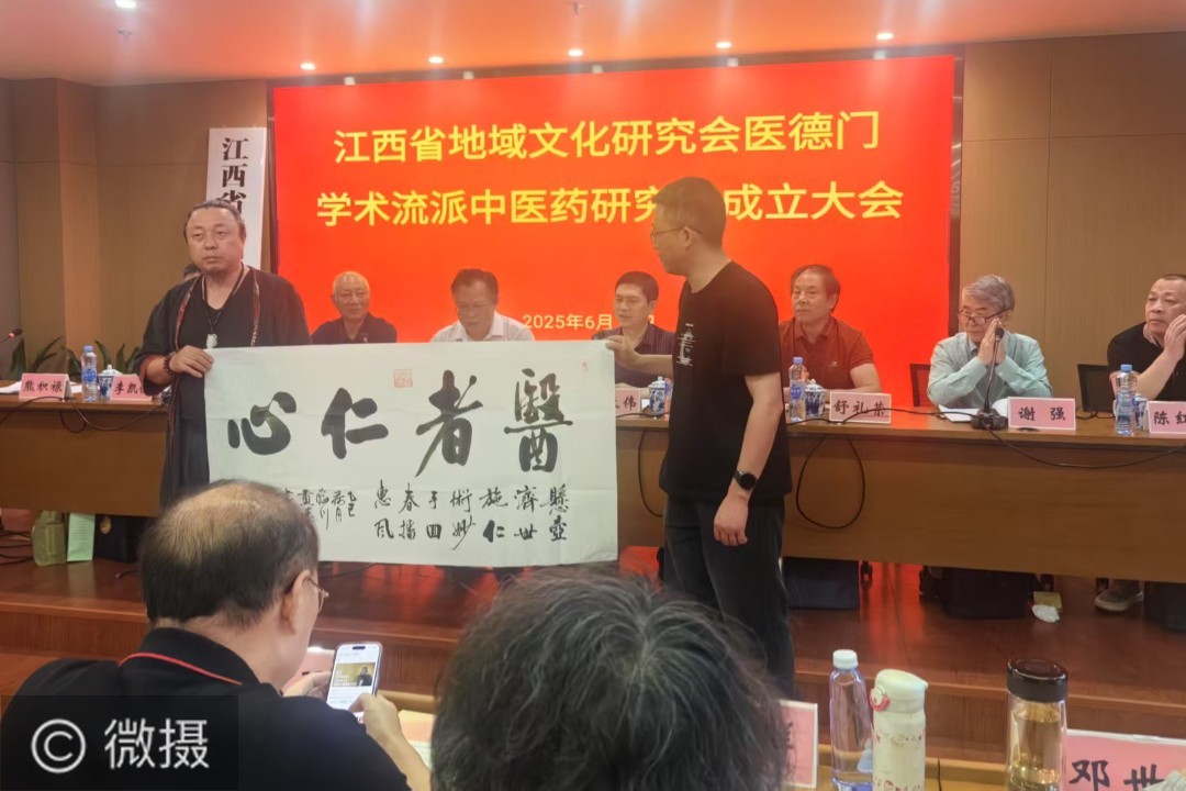 江西省地域文化研究会医德门学术流派中医药研究院成立大会6月15日上午在省教育传媒集团举行,来自全省各地的中医药专家学者及媒体齐聚一堂。研究会会长万明华与蒋国辉为研究院揭牌,图为邓大勇,黄玮等代表临汝工委以来自临川才子书法家黄涛的书法作品对研究院的成立表示热烈祝贺【弘毅社工报道】