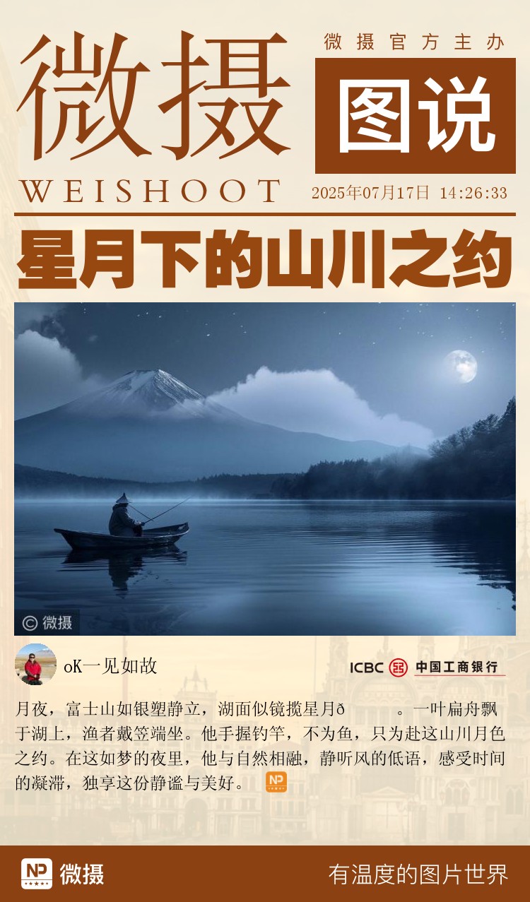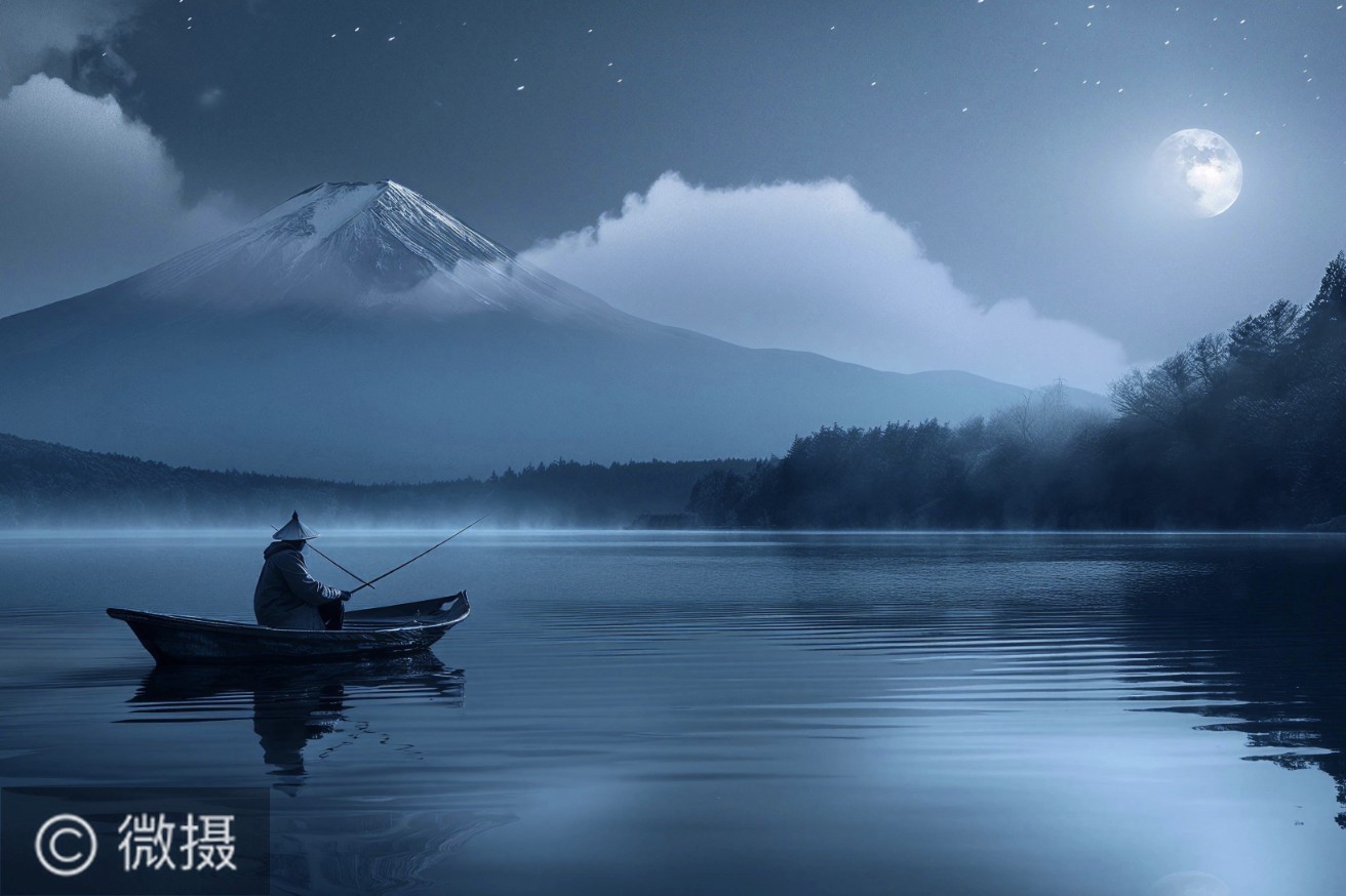 月夜,富士山如银塑静立,湖面似镜揽星月🌙。一叶扁舟飘于湖上,渔者戴笠端坐。他手握钓竿,不为鱼,只为赴这山川月色之约。在这如梦的夜里,他与自然相融,静听风的低语,感受时间的凝滞,独享这份静谧与美好。