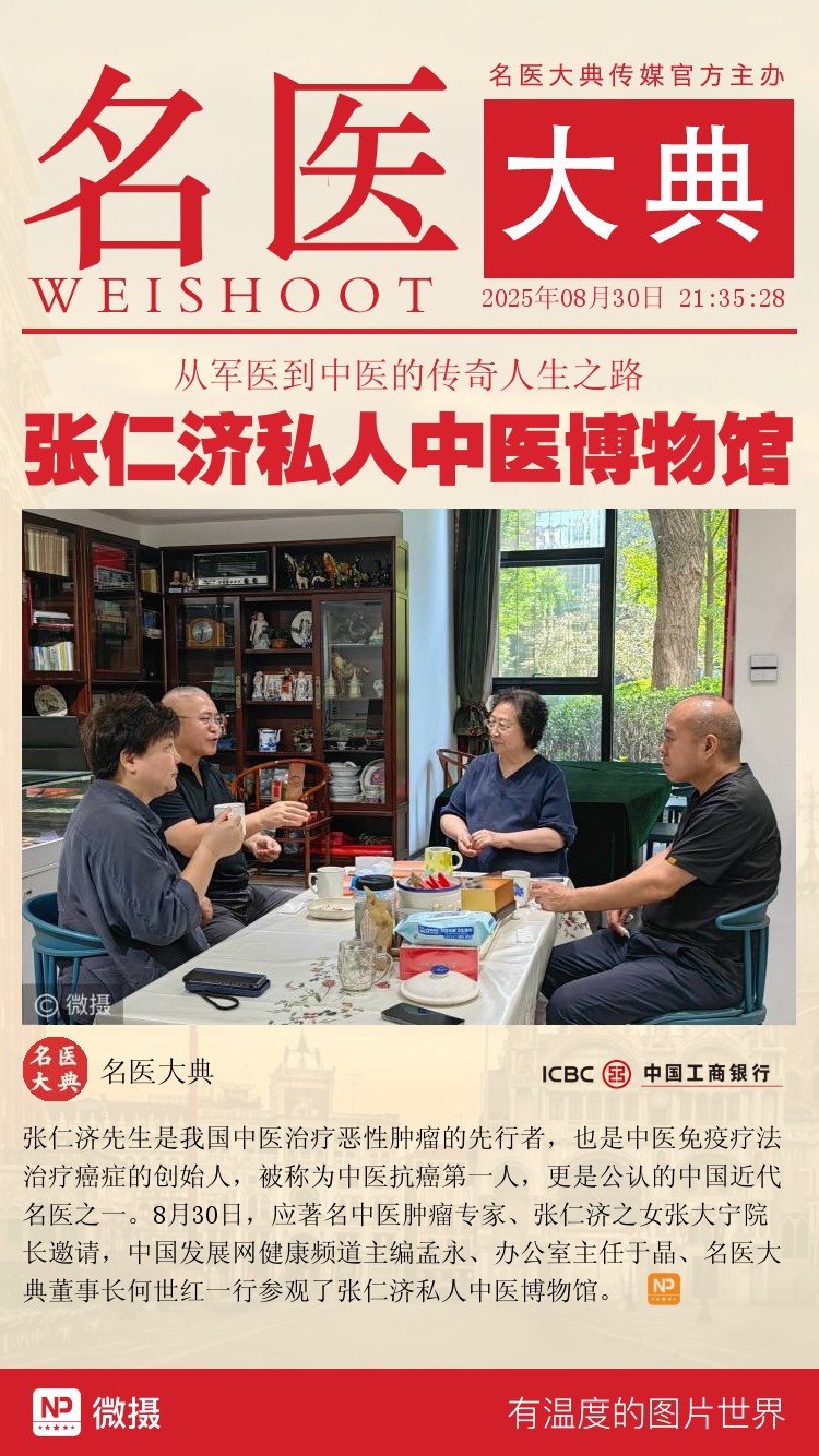 张仁济先生是我国中医治疗恶性肿瘤的先行者,也是中医免疫疗法治疗癌症的创始人,被称为中医抗癌第一人,更是公认的中国近代名医之一。8月30日,应著名中医肿瘤专家、张仁济之女张大宁院长邀请,中国发展网健康频道主编孟永、办公室主任于晶、名医大典董事长何世红一行参观了张仁济私人中医博物馆。