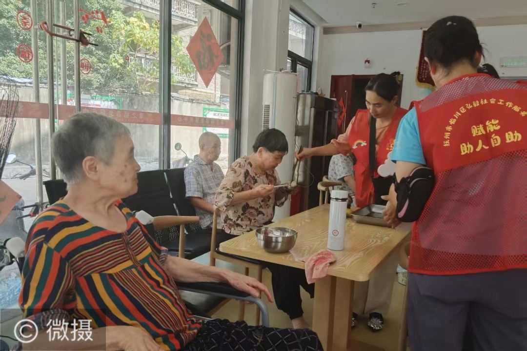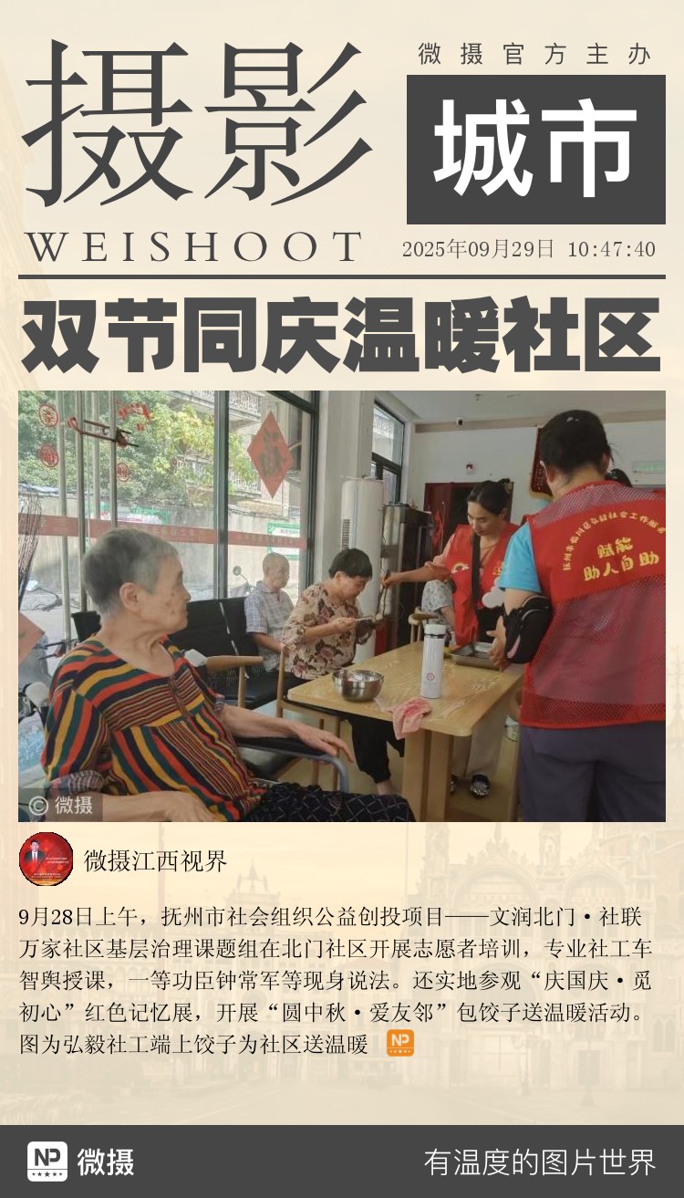 9月28日上午,抚州市社会组织公益创投项目——文润北门·社联万家社区基层治理课题组在北门社区开展志愿者培训,专业社工车智舆授课,一等功臣钟常军等现身说法。还实地参观“庆国庆·觅初心”红色记忆展,开展“圆中秋·爱友邻”包饺子送温暖活动。图为弘毅社工端上饺子为社区送温暖