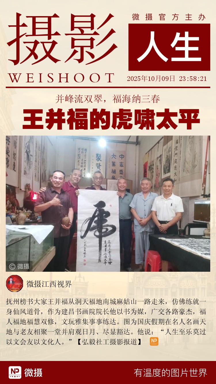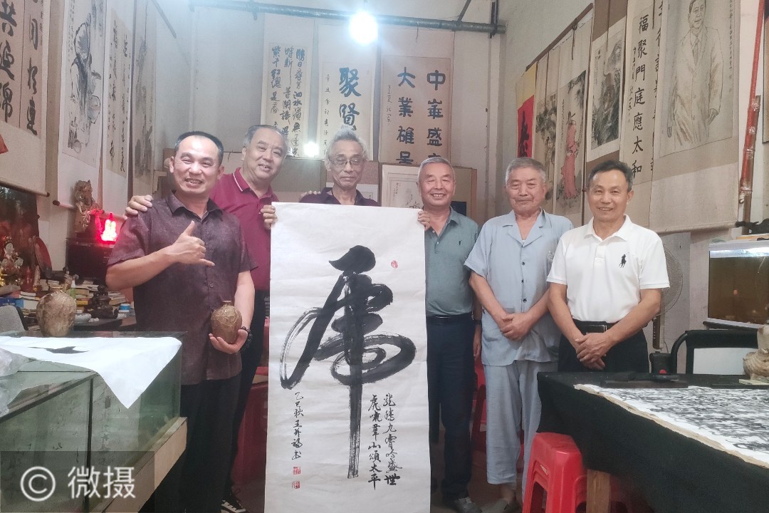 抚州榜书大家王并福从洞天福地南城麻姑山一路走来,仿佛练就一身仙风道骨,作为建昌书画院院长他以书为媒,广交各路豪杰,福人福地福慧双修,文玩雅集事事练达。图为国庆假期在名人名画天地与老友相聚一堂并肩观日月、尽显豁达。他说:“人生至乐莫过以文会友以文化人。”【弘毅社工摄影报道】
