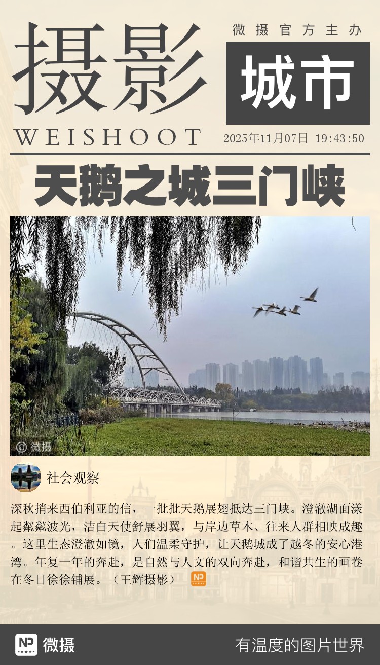 深秋捎来西伯利亚的信,一批批天鹅展翅抵达三门峡。澄澈湖面漾起粼粼波光,洁白天使舒展羽翼,与岸边草木、往来人群相映成趣。这里生态澄澈如镜,人们温柔守护,让天鹅城成了越冬的安心港湾。年复一年的奔赴,是自然与人文的双向奔赴,和谐共生的画卷在冬日徐徐铺展。(王辉摄影)