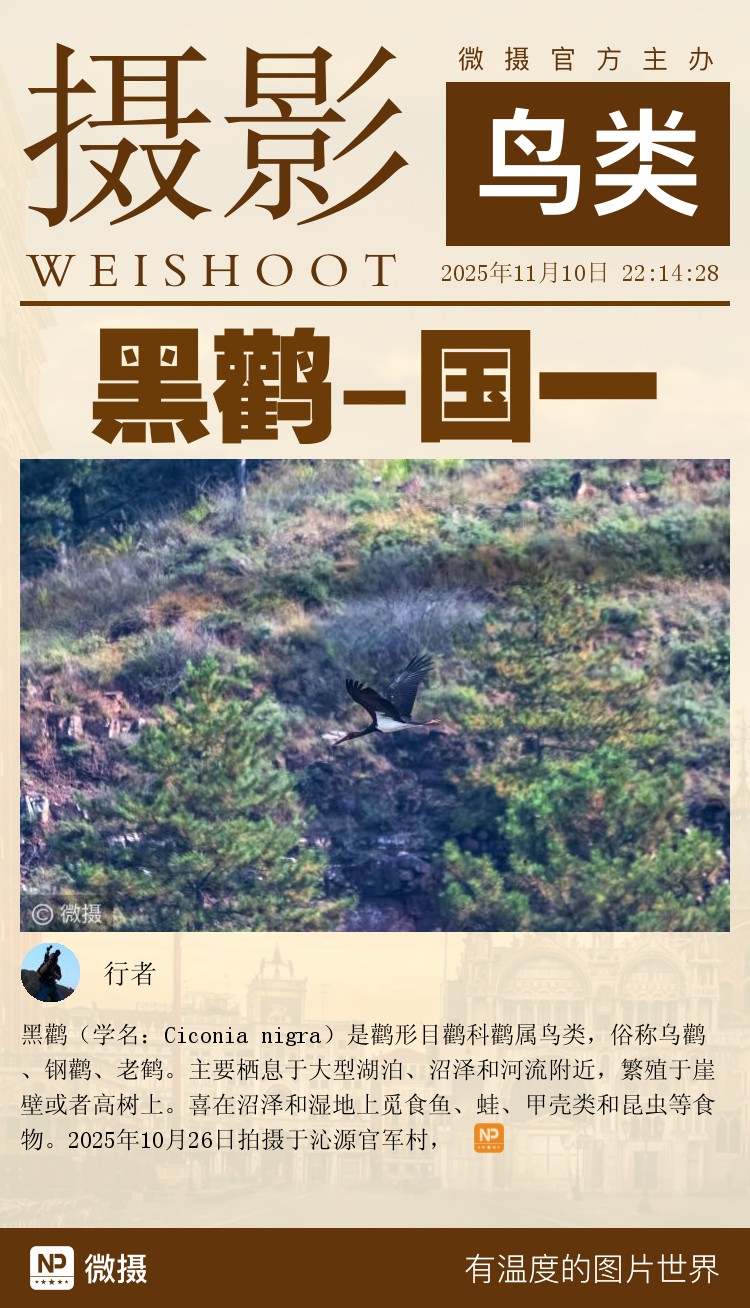 黑鹳(学名:Ciconia nigra)是鹳形目鹳科鹳属鸟类,俗称乌鹳、钢鹳、老鹤。主要栖息于大型湖泊、沼泽和河流附近,繁殖于崖壁或者高树上。喜在沼泽和湿地上觅食鱼、蛙、甲壳类和昆虫等食物。2025年10月26日拍摄于沁源官军村,