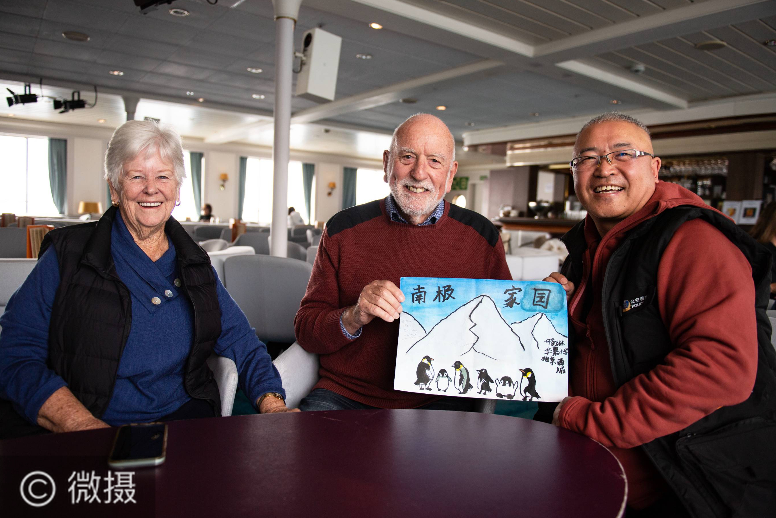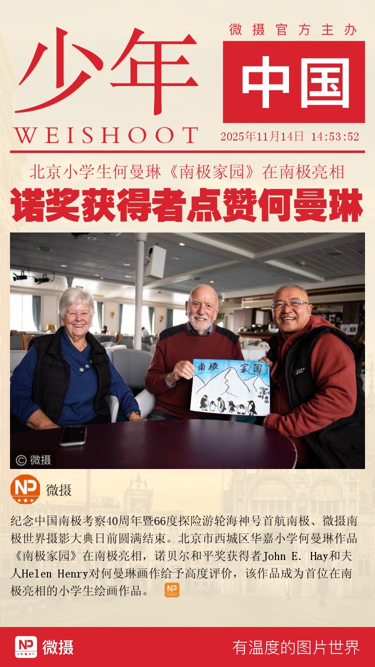 纪念中国南极考察40周年暨66度探险游轮海神号首航南极、微摄南极世界摄影大典日前圆满结束。北京市西城区华嘉小学何曼琳作品《南极家园》在南极亮相,诺贝尔和平奖获得者John E. Hay和夫人Helen Henry对何曼琳画作给予高度评价,该作品成为首位在南极亮相的小学生绘画作品。