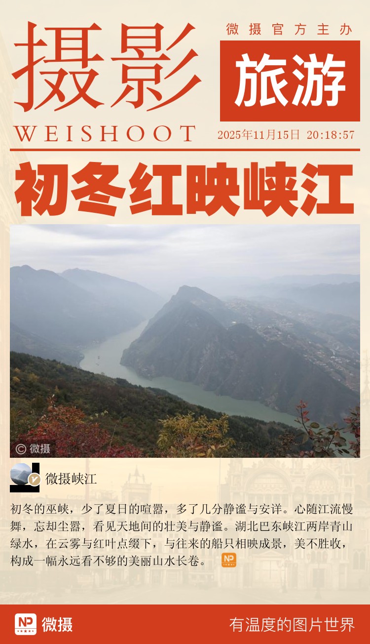 初冬的巫峡,少了夏日的喧嚣,多了几分静谧与安详。心随江流慢舞,忘却尘嚣,看见天地间的壮美与静谧。湖北巴东峡江两岸青山绿水,在云雾与红叶点缀下,与往来的船只相映成景,美不胜收,构成一幅永远看不够的美丽山水长卷。