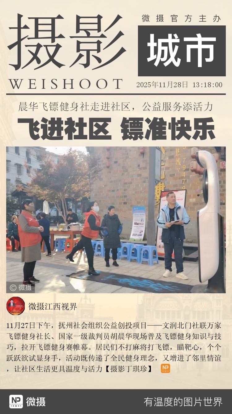 11月27日下午,抚州社会组织公益创投项目——文润北门社联万家飞镖健身社长、国家一级裁判员胡晨华现场普及飞镖健身知识与技巧,拉开飞镖健身赛帷幕。居民们不打麻将打飞镖,瞄靶心,个个跃跃欲试显身手,活动既传递了全民健身理念,又增进了邻里情谊,让社区生活更具温度与活力【摄影丁琪珍】