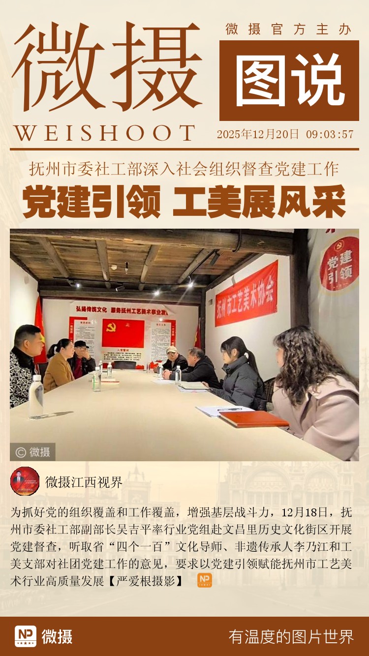 为抓好党的组织覆盖和工作覆盖,增强基层战斗力,12月18日,抚州市委社工部副部长吴吉平率行业党组赴文昌里历史文化街区开展党建督查,听取省“四个一百”文化导师、非遗传承人李乃江和工美支部对社团党建工作的意见,要求以党建引领赋能抚州市工艺美术行业高质量发展【严爱根摄影】