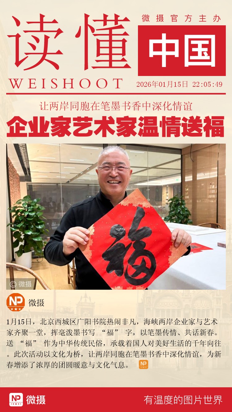 1月15日,北京西城区广阳书院热闹非凡,海峡两岸企业家与艺术家齐聚一堂,挥毫泼墨书写 “福” 字,以笔墨传情、共话新春。送 “福” 作为中华传统民俗,承载着国人对美好生活的千年向往。此次活动以文化为桥,让两岸同胞在笔墨书香中深化情谊,为新春增添了浓厚的团圆暖意与文化气息。