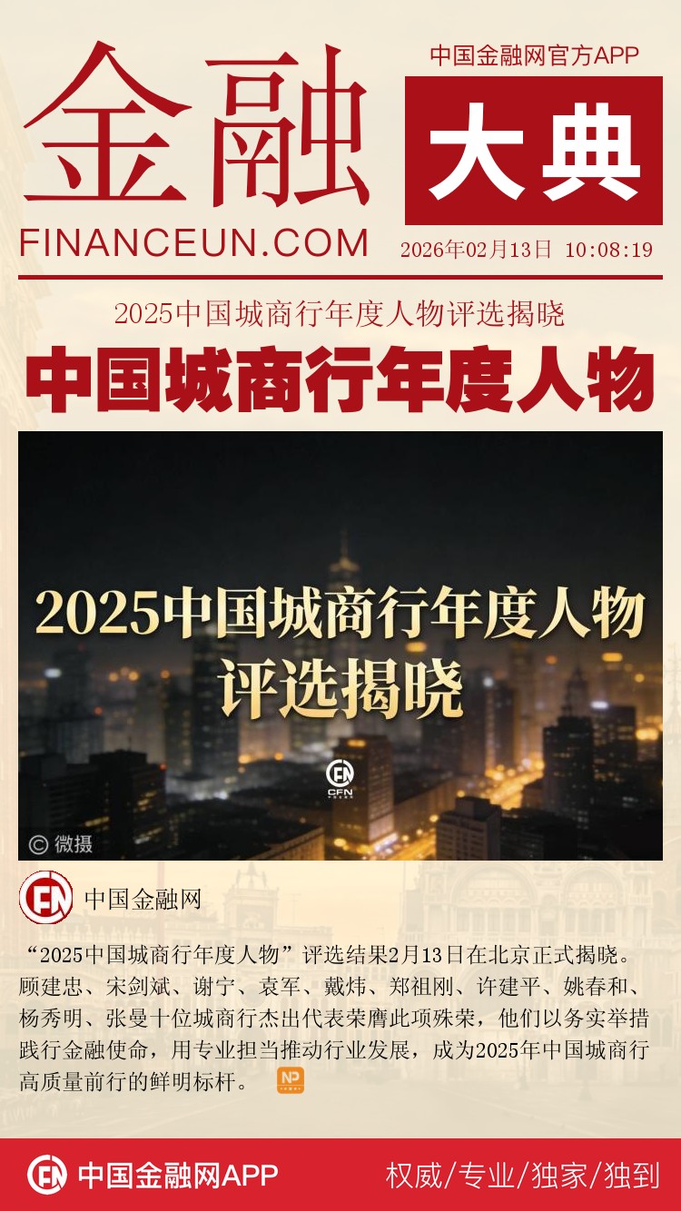 “2025中国城商行年度人物”评选结果2月13日在北京正式揭晓。顾建忠、宋剑斌、谢宁、袁军、戴炜、郑祖刚、许建平、姚春和、杨秀明、张曼十位城商行杰出代表荣膺此项殊荣,他们以务实举措践行金融使命,用专业担当推动行业发展,成为2025年中国城商行高质量前行的鲜明标杆。