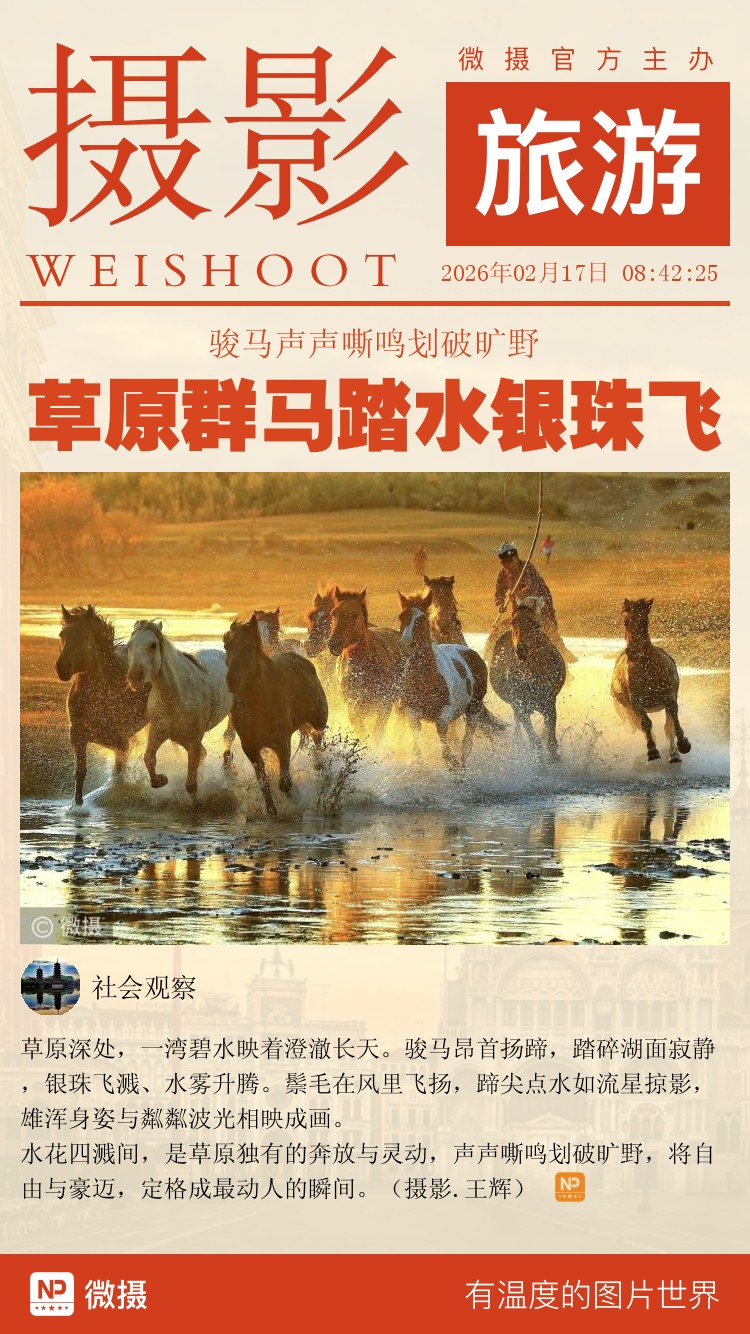 草原深处,一湾碧水映着澄澈长天。骏马昂首扬蹄,踏碎湖面寂静,银珠飞溅、水雾升腾。鬃毛在风里飞扬,蹄尖点水如流星掠影,雄浑身姿与粼粼波光相映成画。 水花四溅间,是草原独有的奔放与灵动,声声嘶鸣划破旷野,将自由与豪迈,定格成最动人的瞬间。(摄影.王辉)