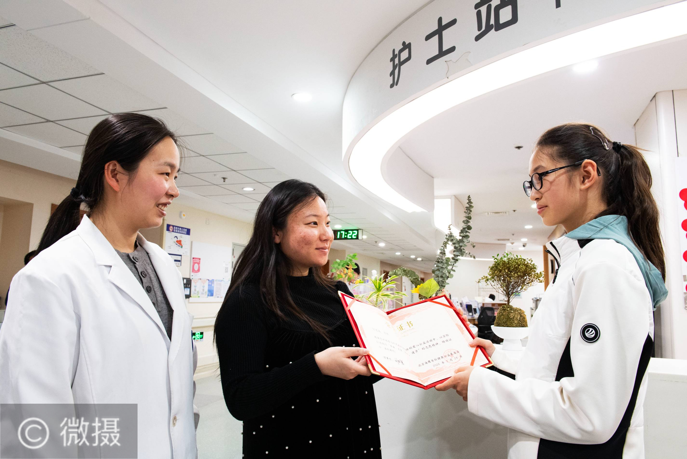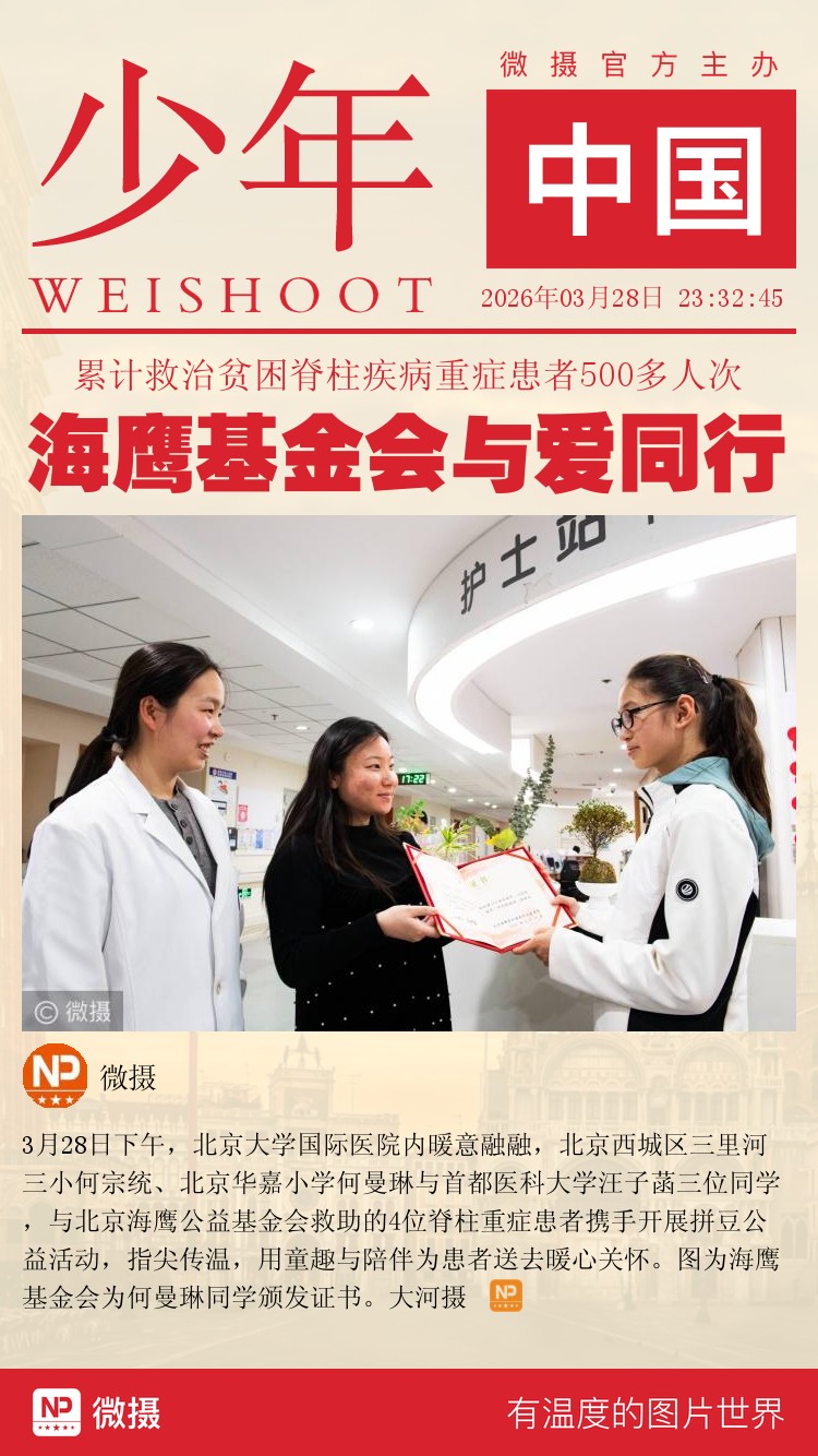 3月28日下午,北京大学国际医院内暖意融融,北京西城区三里河三小何宗统、北京华嘉小学何曼琳与首都医科大学汪子菡三位同学,与北京海鹰公益基金会救助的4位脊柱重症患者携手开展拼豆公益活动,指尖传温,用童趣与陪伴为患者送去暖心关怀。图为海鹰基金会为何曼琳同学颁发证书。大河摄