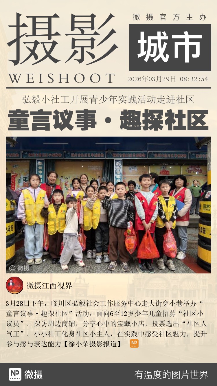 3月28日下午,临川区弘毅社会工作服务中心走大街穿小巷举办“童言议事·趣探社区”活动,面向6至12岁少年儿童招募“社区小议员”。探访周边商铺,分享心中的宝藏小店,投票选出“社区人气王”。小小社工化身社区小主人,在实践中感受社区魅力,提升参与感与表达能力【徐小荣摄影报道】