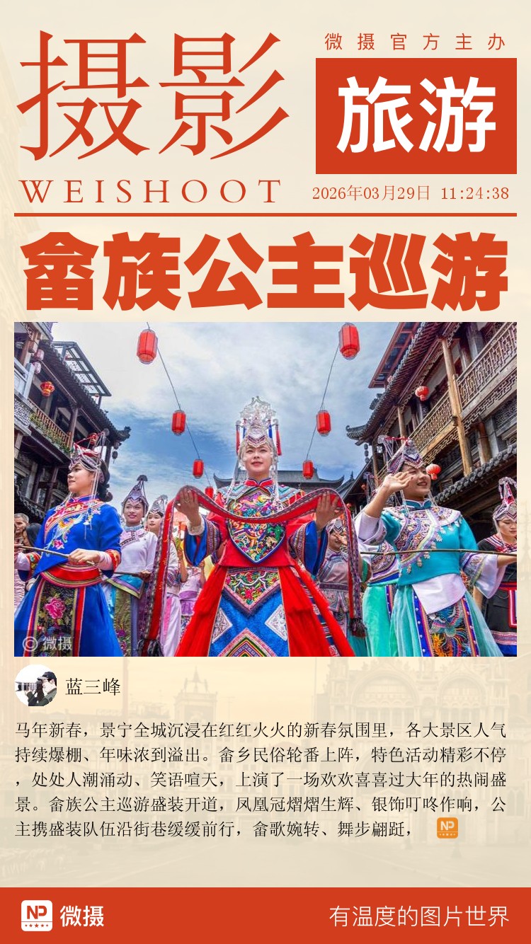 马年新春,景宁全城沉浸在红红火火的新春氛围里,各大景区人气持续爆棚、年味浓到溢出。畲乡民俗轮番上阵,特色活动精彩不停,处处人潮涌动、笑语喧天,上演了一场欢欢喜喜过大年的热闹盛景。畲族公主巡游盛装开道,凤凰冠熠熠生辉、银饰叮咚作响,公主携盛装队伍沿街巷缓缓前行,畲歌婉转、舞步翩跹,