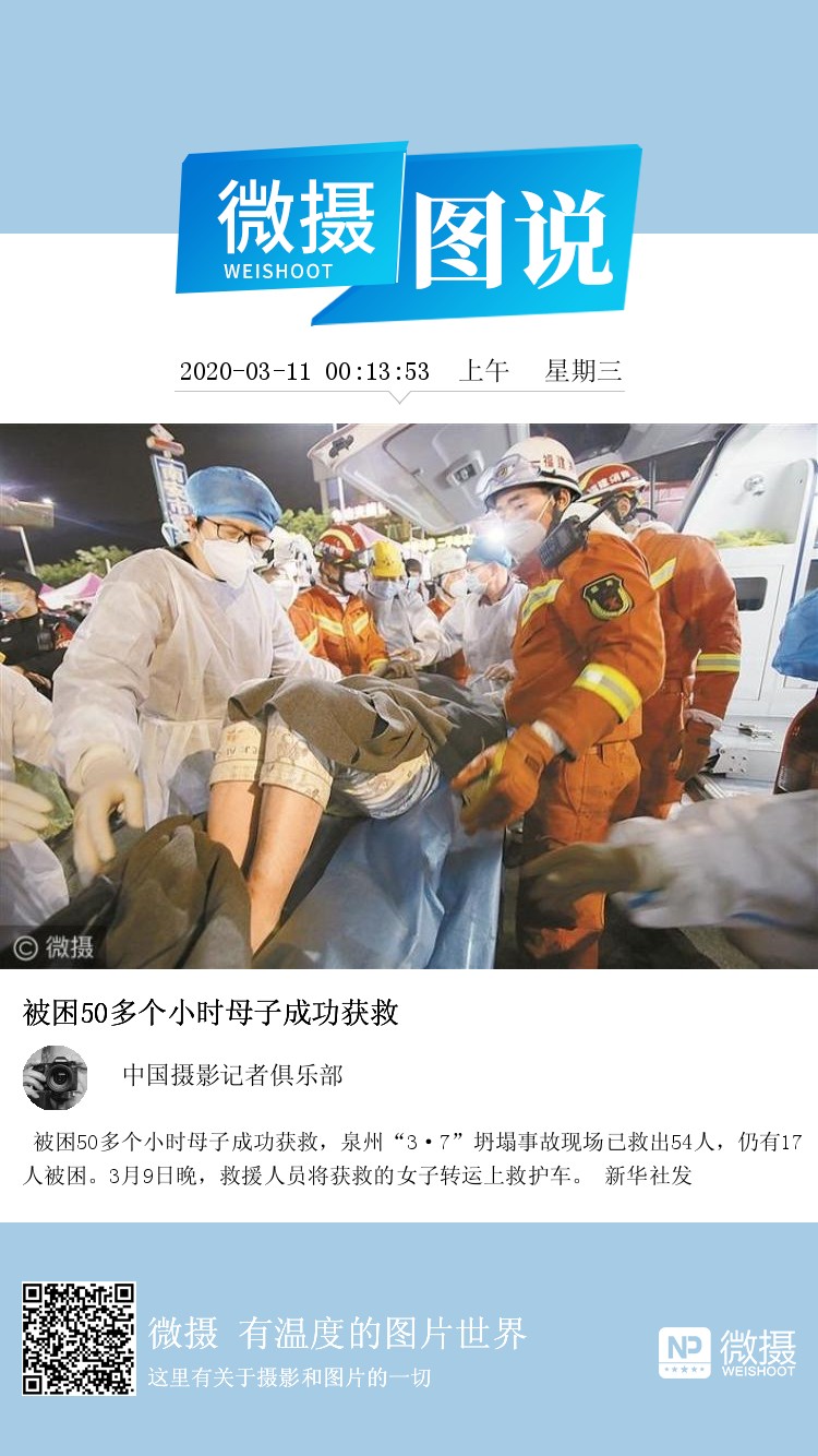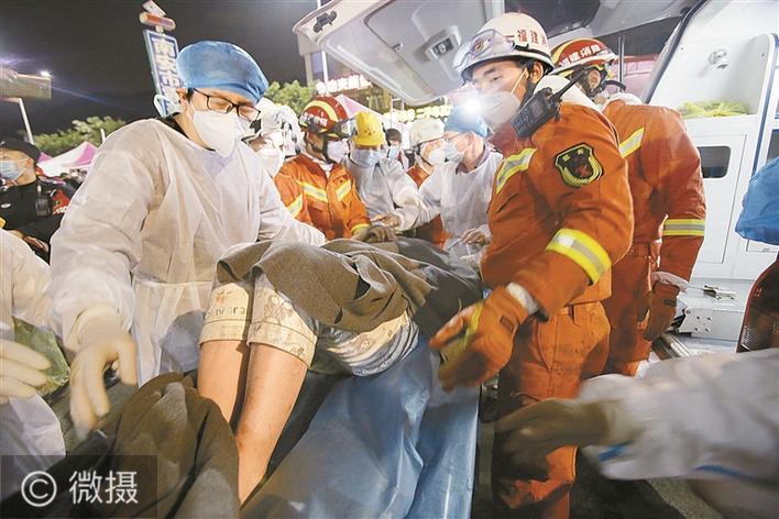 被困50多个小时母子成功获救,泉州“3·7”坍塌事故现场已救出54人,仍有17人被困。3月9日晚,救援人员将获救的女子转运上救护车。 新华社发