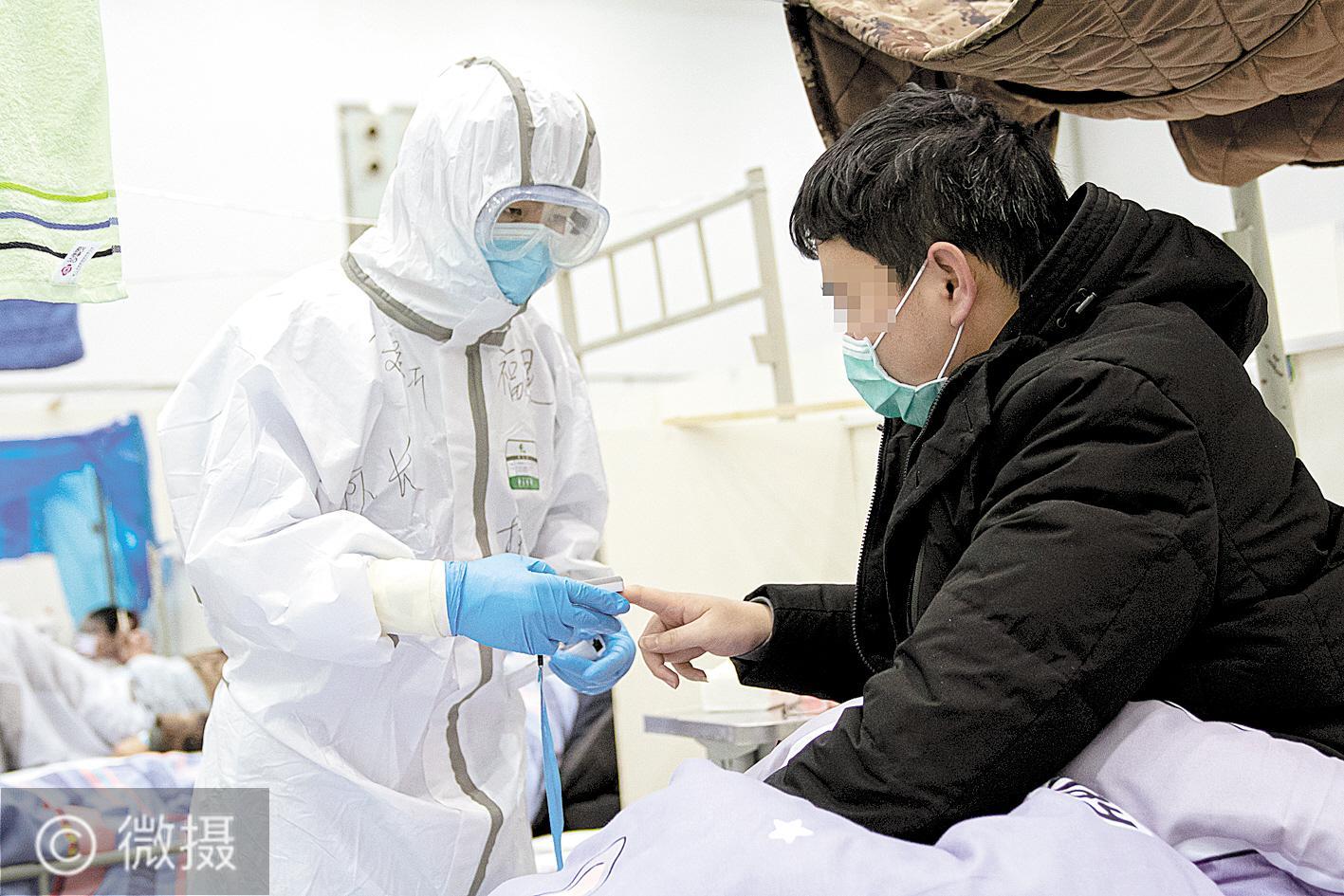 2月10日,在武汉客厅方舱医院,来自福建医疗队1990年出生的薛文新(左)为患者检测血氧含量。(新华社发)