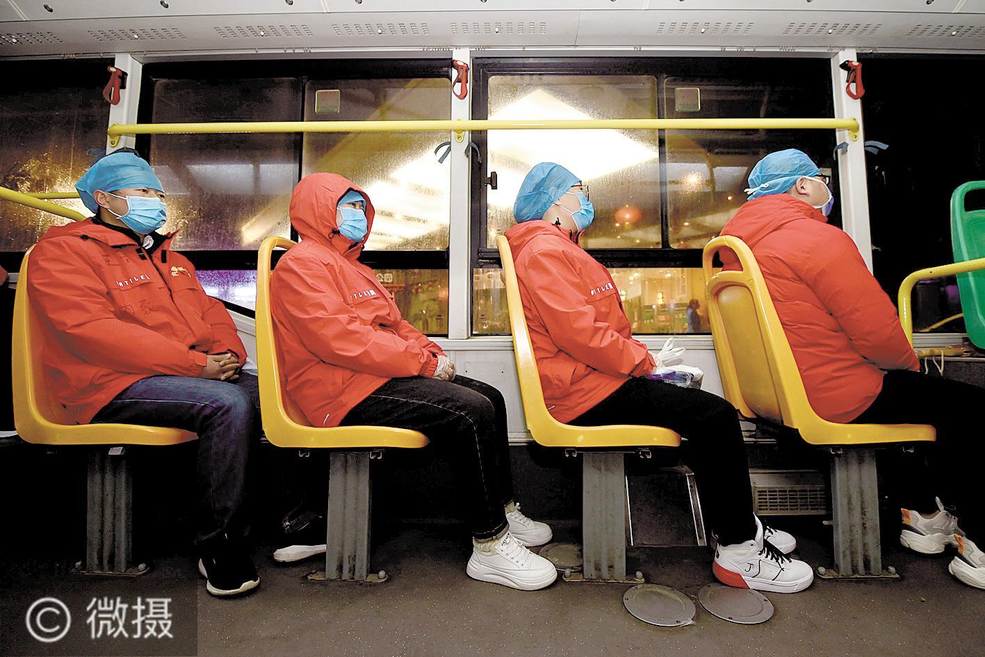 2月28日凌晨1时30分,武汉市洪山区未来城大酒店,即将从酒店驻地出发前往麒麟物流方舱医院的内蒙古医疗队医务人员登上公交车。湖北日报全媒记者 李溪 摄影